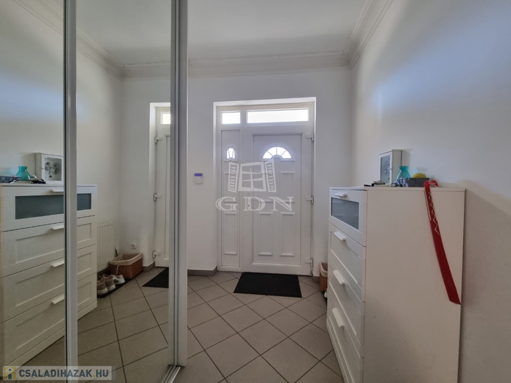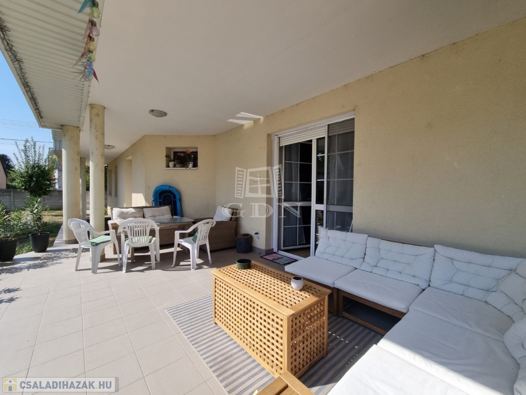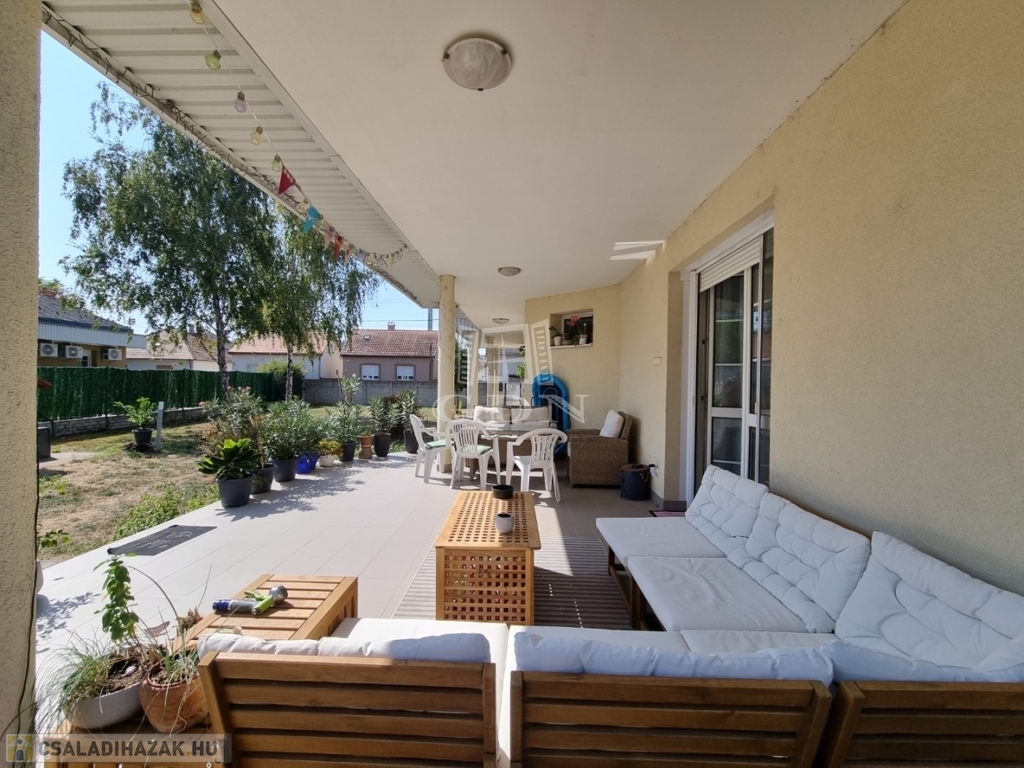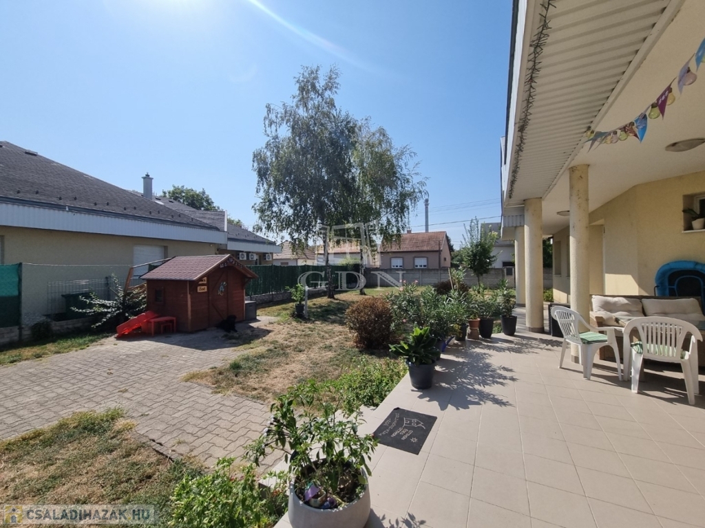 Az utcai kapu elektromosan nyitható, az udvar térkövezett, parkosított. Itt található egy, egy fedett terasz illetve a kertben egy tároló. A kertben kerti kiülő, gyümölcsfa, örökzöld megtalálható. Tehermentes, azonnal költözhető.