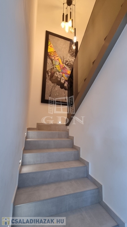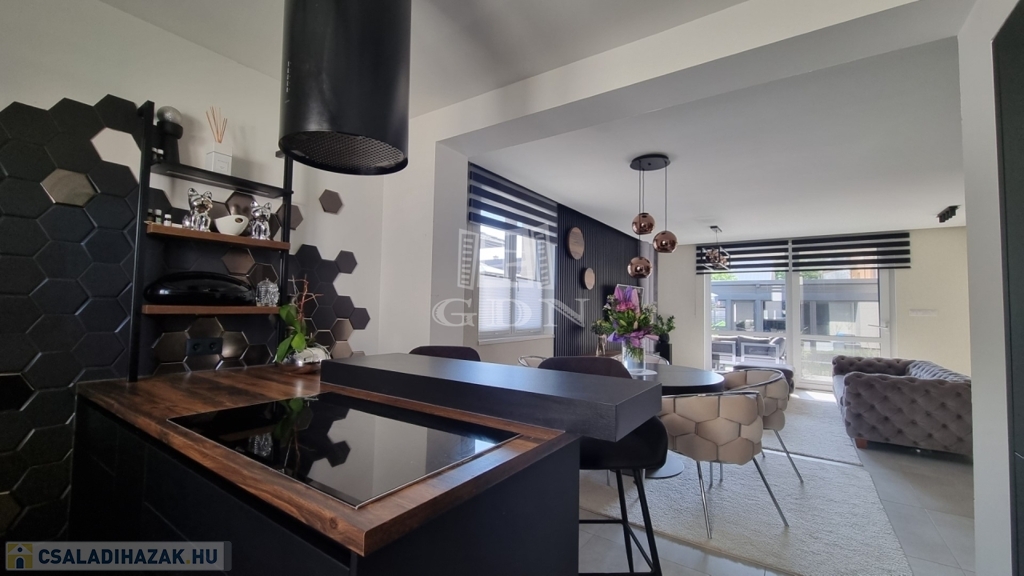 H-004303. Ráchegy, frekventált, kedvelt részén, összközműves építési telken, lakóparki környezetben, eladó egy 2022-ben épült kétszintes, igényes, egyedi kivitelezésű 150m2 hasznos alapterületű, nappali + 4 szobás+ jakuzzi, szaunaház/ konditeremmel ellátott önálló telekterülettel rendelkező családi ház, garázzsal, terasszal.