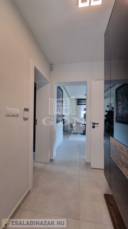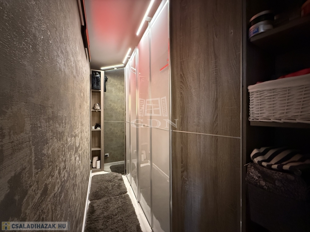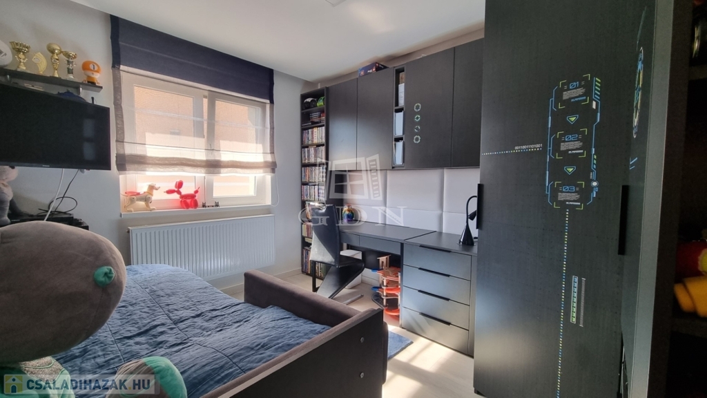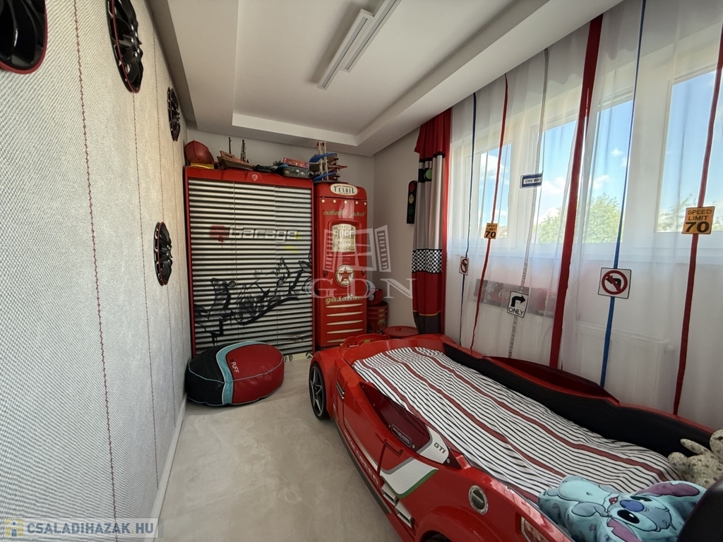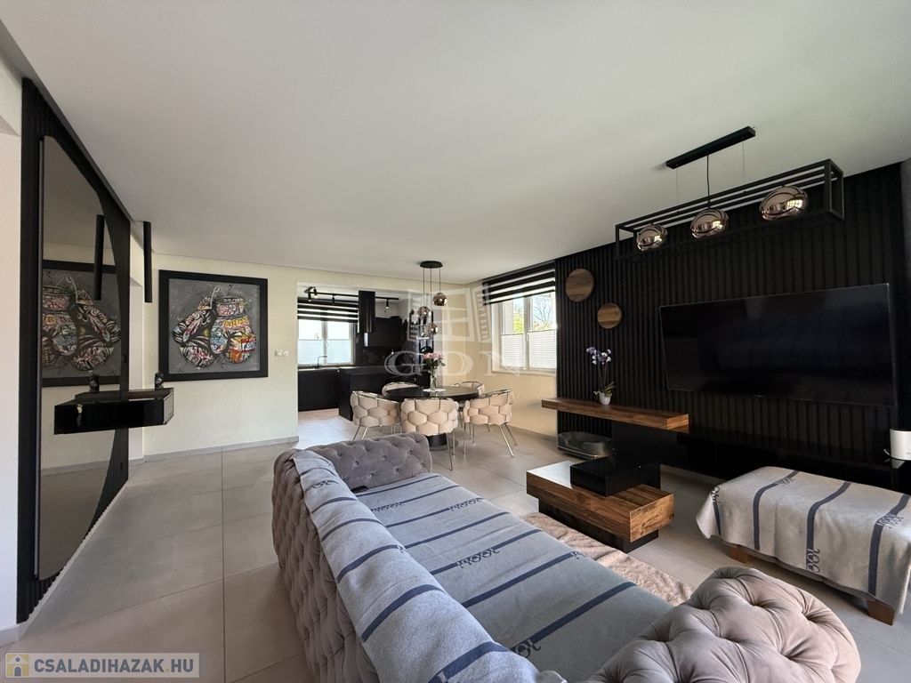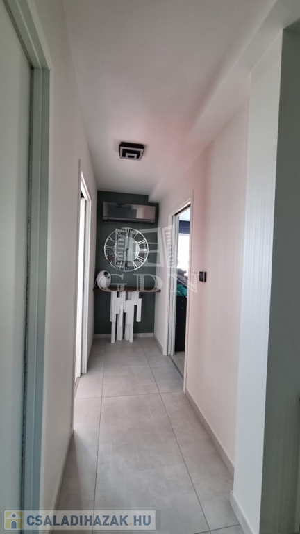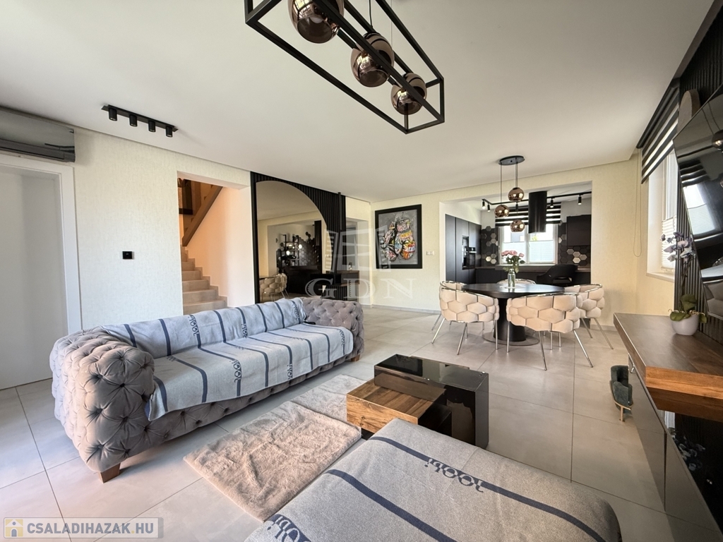 A ház téglaépítésű, szigetelt, tágas, világos, körbe napozott, minőségi anyagokból készült. A burkolatokat tekintve a szobákban magas minőségű laminált padló, a nappaliban a közlekedőben, valamint a konyhában és a vizes helyiségekben jó minőségű járólap található. A nyílászárók 3 rétegű műanyagból készültek, hőszigetelt üvegezéssel, rajtuk redőny és szúnyogháló található. A házban klíma kiépítésre került. A 20m2-es terasz, kényelmes pihenést biztosít. Az utcai kapu elektromosan nyitható. A telek örökzöldekkel, dísznövényekkel parkosított, pihenő terasz, gyermekjátszótér, és egy 27m2-es szauna/konditerem kiépített zuhanyzóval, gépészettel, valamint egy jakuzzi található benne.