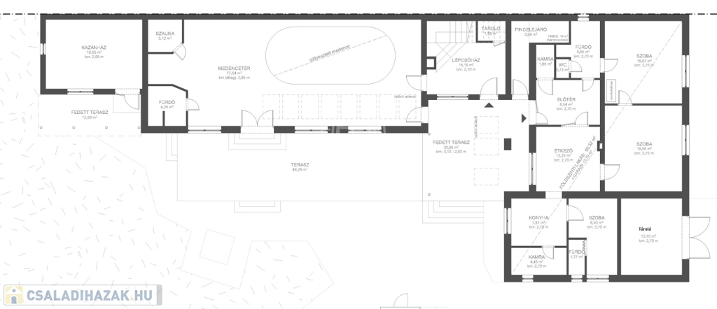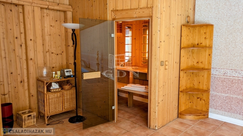 - 80 négyzetméteres pihenőtérben ellenáramoltatóval, vízmasszázzsal ellátott úszómedence, finn és infraszauna, zuhanyzó wc is helyet kapott – mindez közvetlen kapcsolattal a kazánházhoz és a háztartási helyiséghez, amely a lépcsőházból, a kert felől és a teraszról is külön bejáraton keresztül is megközelíthető.