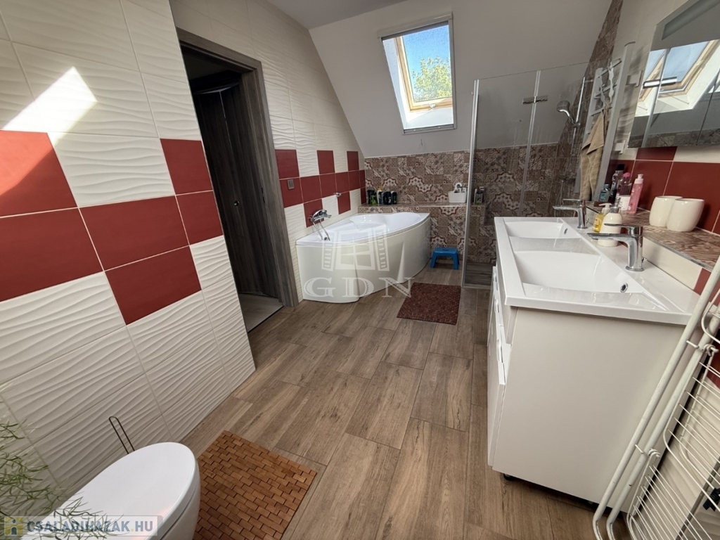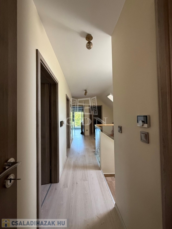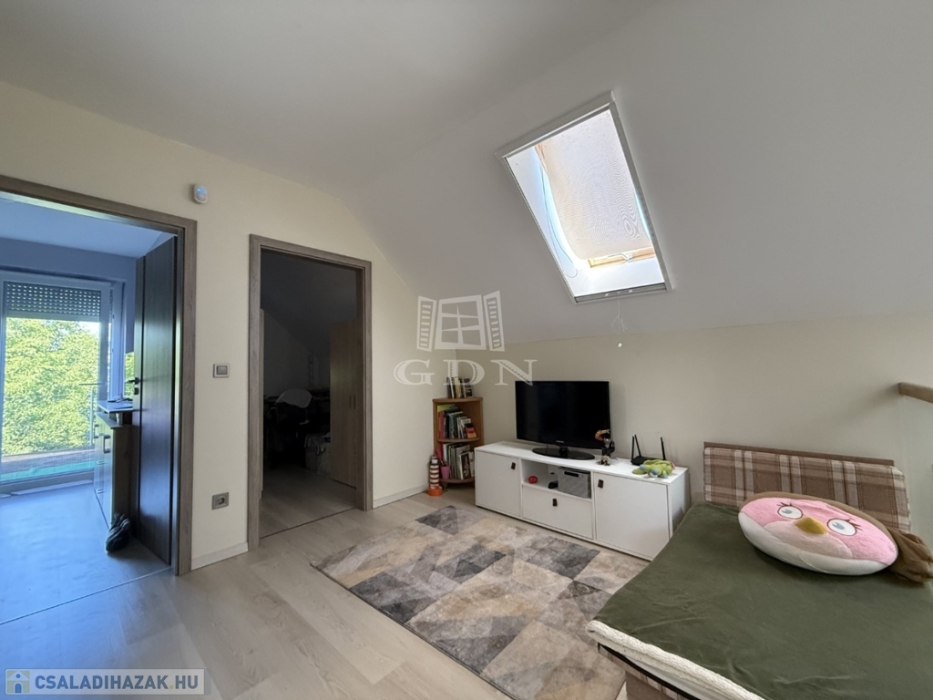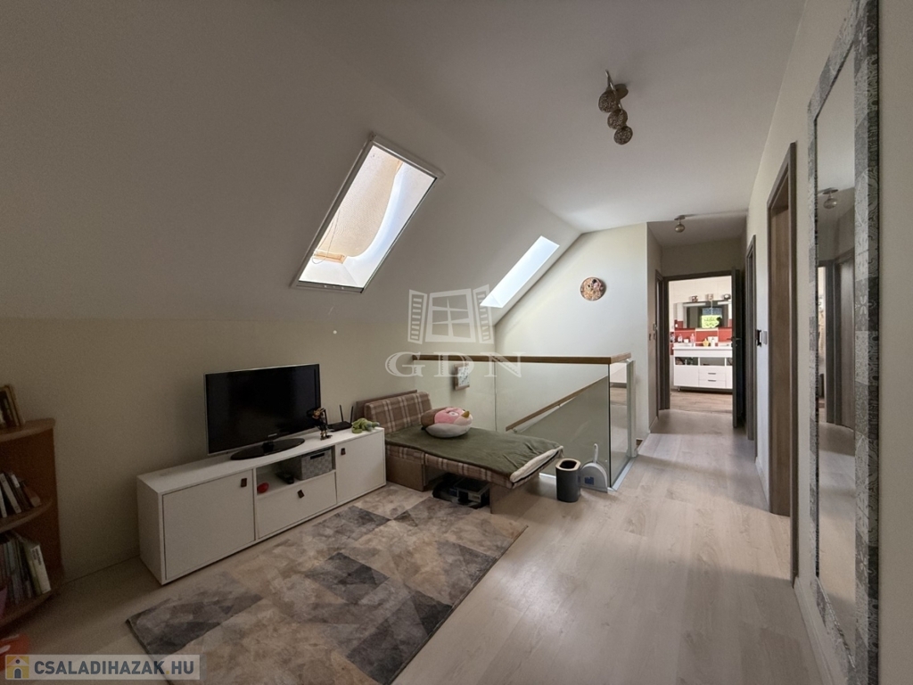 ‣ Tetőtér: kis nappali, három hálószoba (a szülői hálóhoz 9 m²-es terasz kapcsolódik), gardrób, egy kisebb dolgozószoba, fürdőszoba és WC.