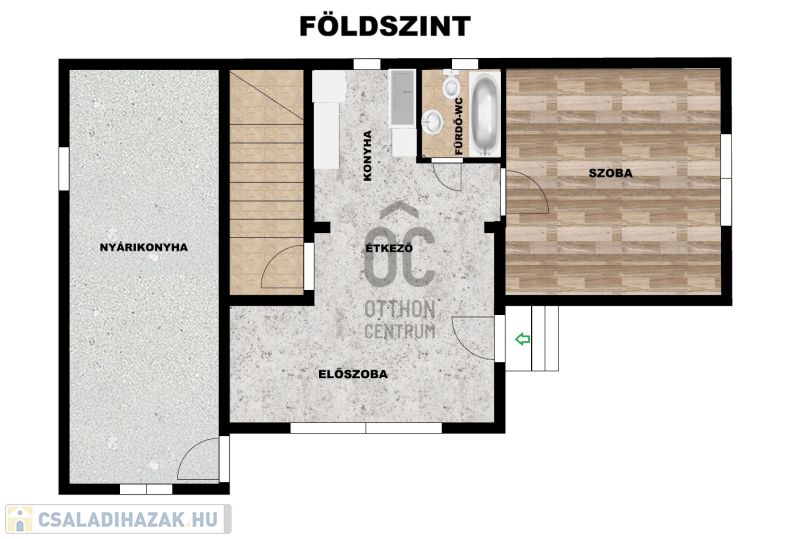 Földszint (47,4m2): előszoba, étkező és konyha egy légtérben helyezkedik el. Innen nyílik még egy szoba, egy fürdő-WC és lépcsőház, mely a szuterénbe vezet.