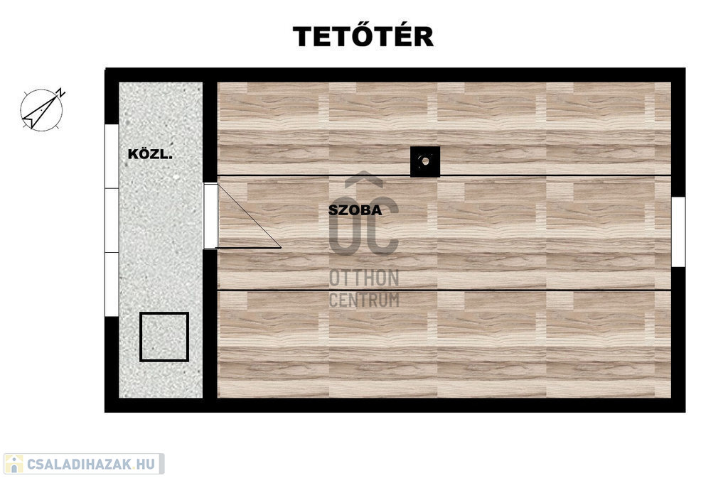 Tetőtér (12,4m2): az előszobából lenyitható lépcsőn lehet feljutni. Közlekedő és egy nagy szoba fogad bennünket.
