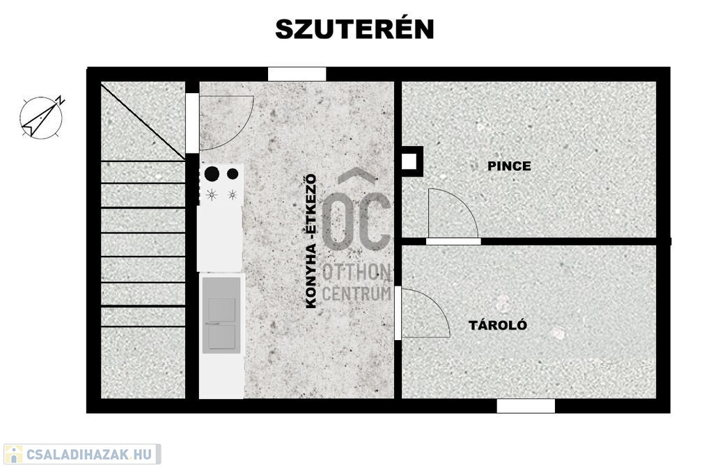 Szuterén (29,4m2): egy fűtött, tágas konyha-étkező, egy kamra és egy pincehelységből áll