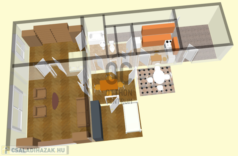 Elosztás: tágas nappali, három szoba, konyha, előszoba, fürdőszoba és külön WC.