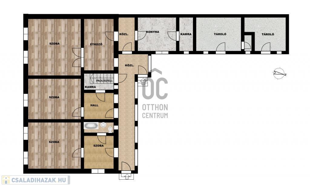 Szobák padlóburkolata laminált parketta, többi helyiség járólap.