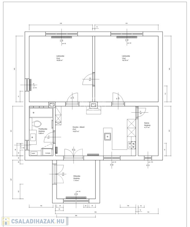 A ház 79m2 hasznos alapterületű, elosztását tekintve: