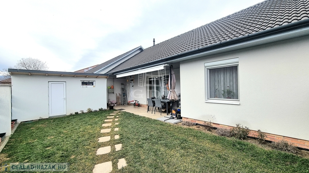 A kertben önálló 7 nm-es tárolóház épült, a 17 nm-es terasz motoros napellenzővel árnyékolható.