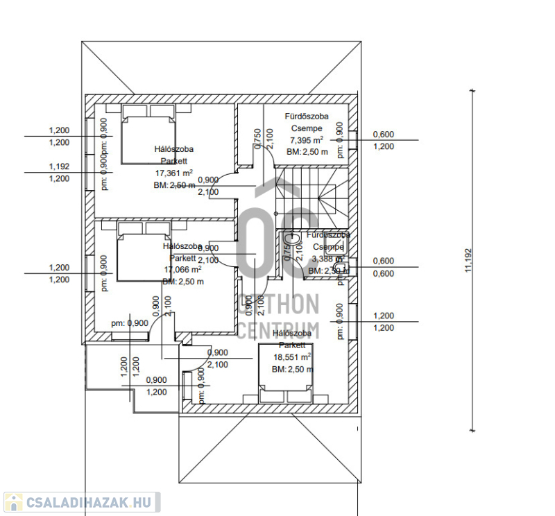 Emelet: Három tágas hálószoba (melyből kettő teraszkapcsolatos), az egyik szobához saját fürdőszoba is tartozik.