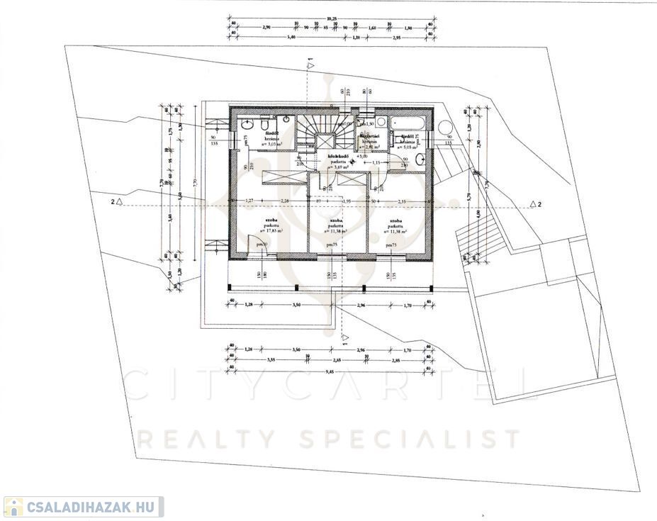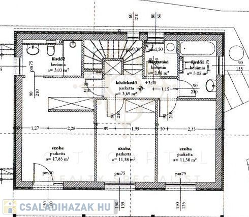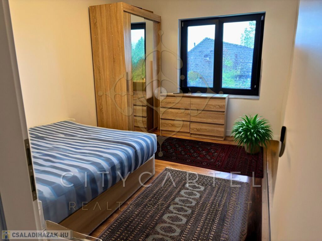 Emelet: 3 hálószoba, 2 fürdőszoba (az egyik káddal, a másik zuhanyzóval), háztartási helyiség, beépített szekrények a folyosón.