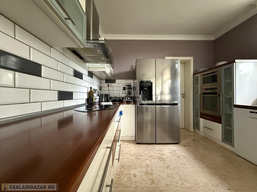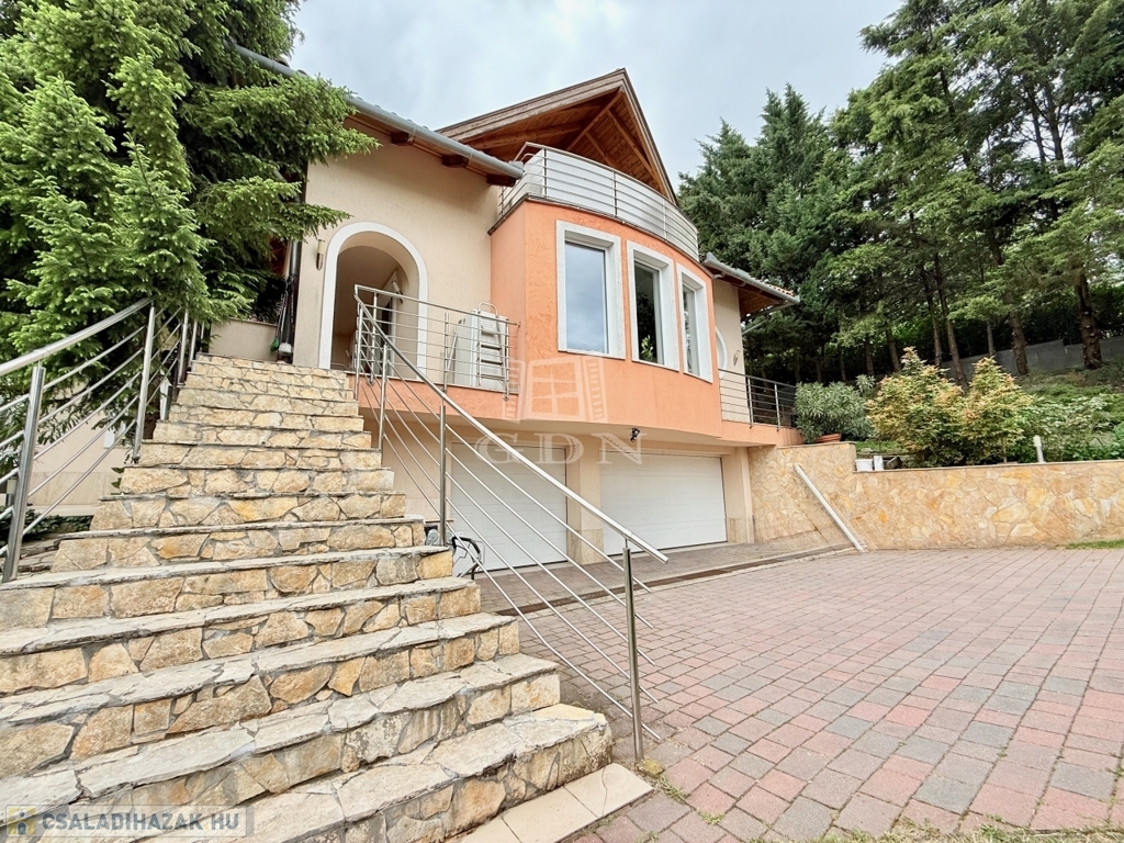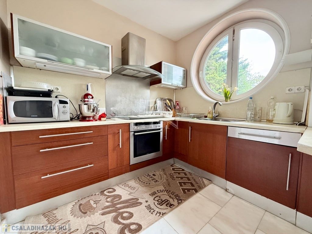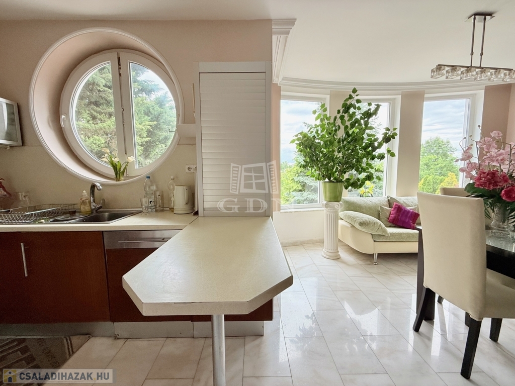 Az alsó szinten található háromállásos garázs, borospince, konditerem és több tárolóhelyiség gondoskodik a kényelemről. A ház körül gondozott kert, a teraszokról pedig lenyűgöző panoráma nyílik Szentendrére és a környező zöldövezetre.