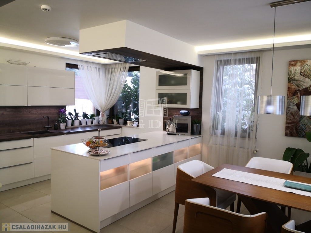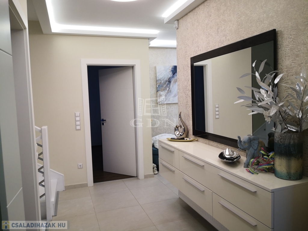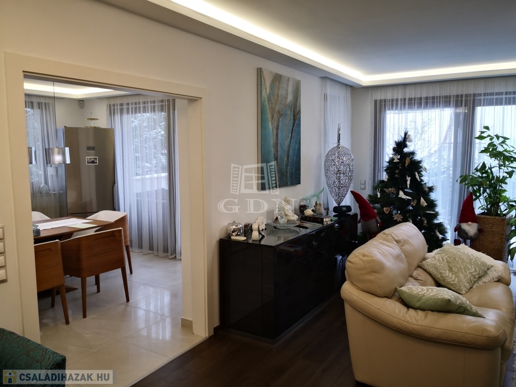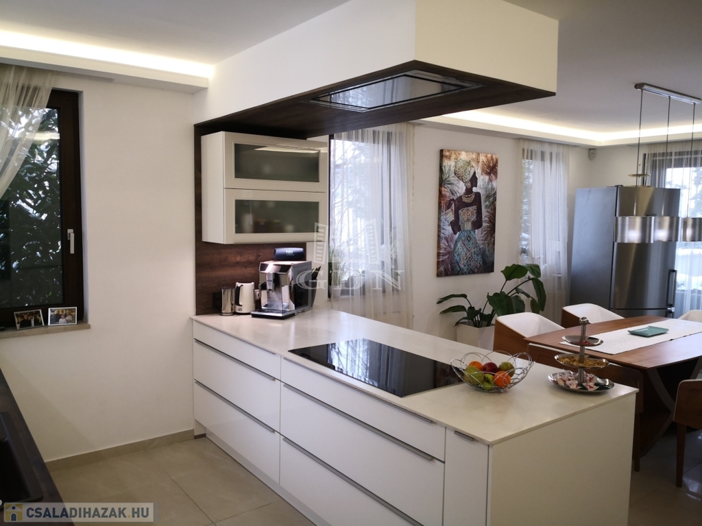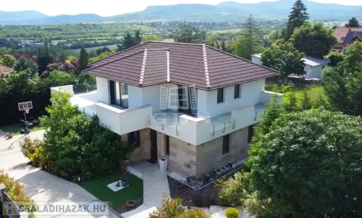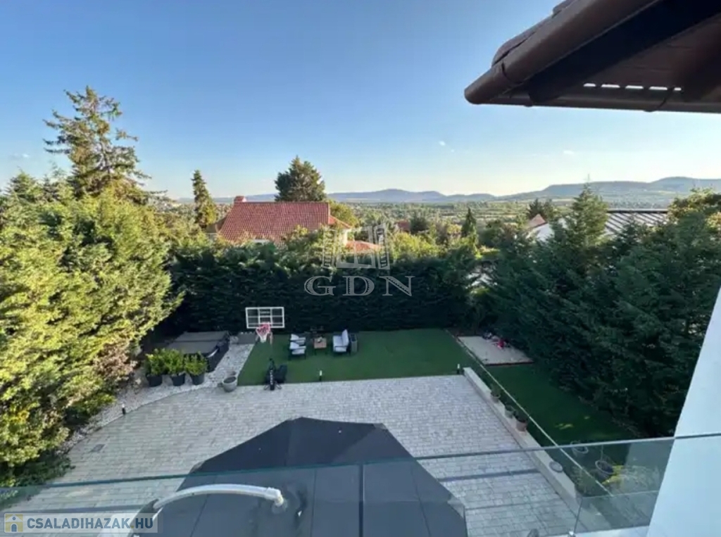 Szentendre Pismány-ban, nyugodt, kertvárosi, zöld környezetben új tulajdonosát várja a fotókon látható, modern, elegáns, panorámás, minden tekintetben prémium színvonalú, teljesen újszerű családi ház.