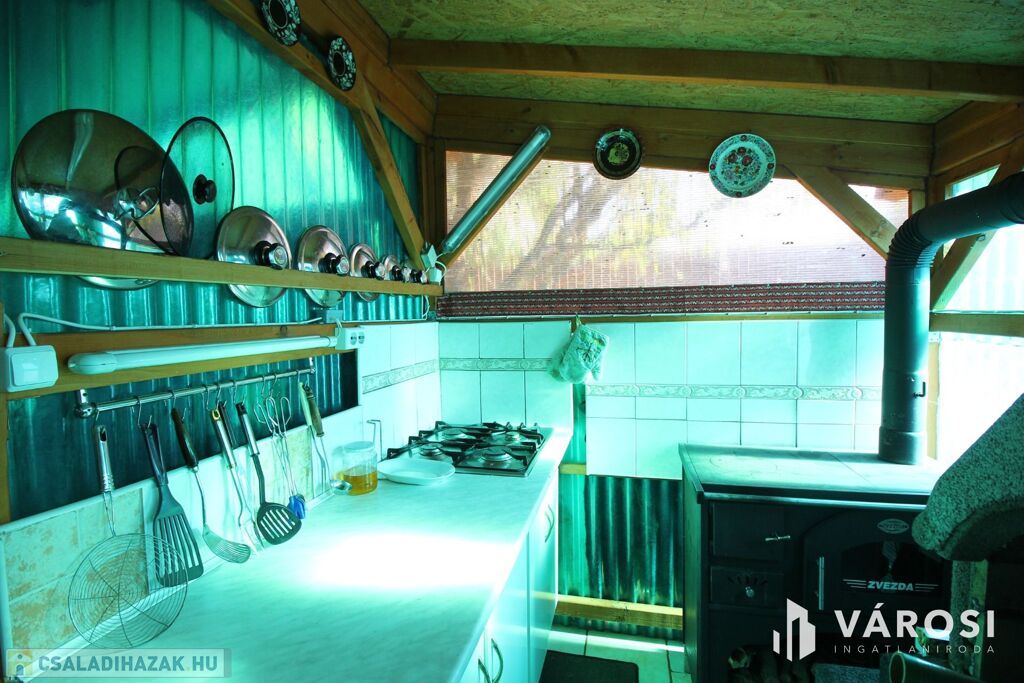 A kertben kialakítottak közvetlenül a dísztó és a sziklakert mellett egy összkomfortos nyári konyhát étkezővel 30m2-en ahol beépített tűzhely, sparhelt, kemence, sütő, grillező, mosogató stb. is beépítésre került. Mellette kényelmes kör panorámás 30 nm2-es ebédlő lett kialakítva, itt 18-20 fős társaság kényelmesen vendégül látható.