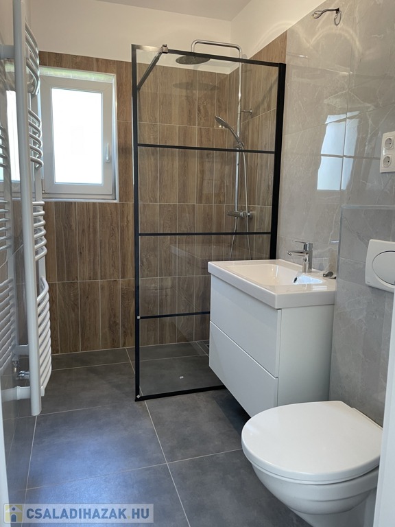 A tágas fürdőben esőztetős minőségi épített zuhany került kialakításra.