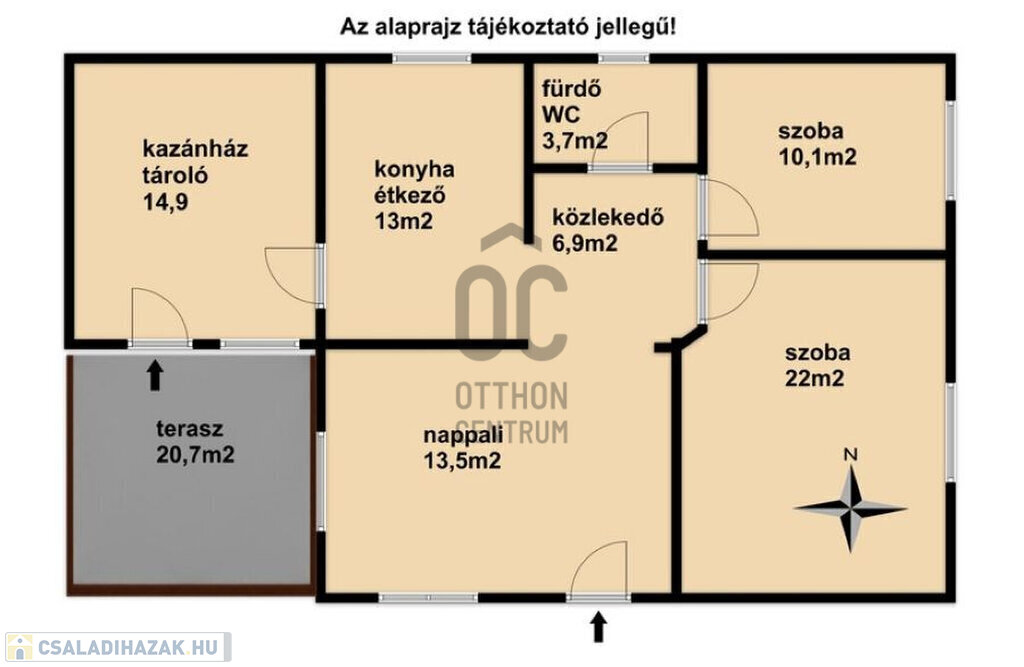 - Helyiségek: 2 szoba, konyha-étkező, nappali, kazánház-tároló, közlekedő, fürdőszoba-WC.