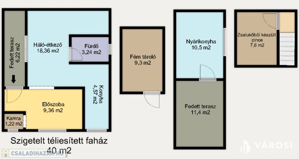 A faház teteje palával és lemezzel borított, a nyári konyha teljesen lemeztetős, a pince pedig zsalukővel, betonból készült, teljesen száraz, tárolásra alkalmas.