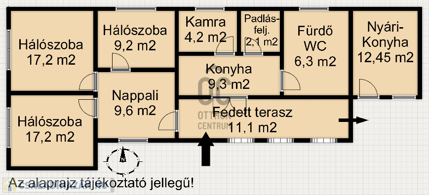 - helyiségek: 3 hálószoba, 1 nappali, konyha-étkező, fürdő -WC, közlekedő, kamra, tágas terasz