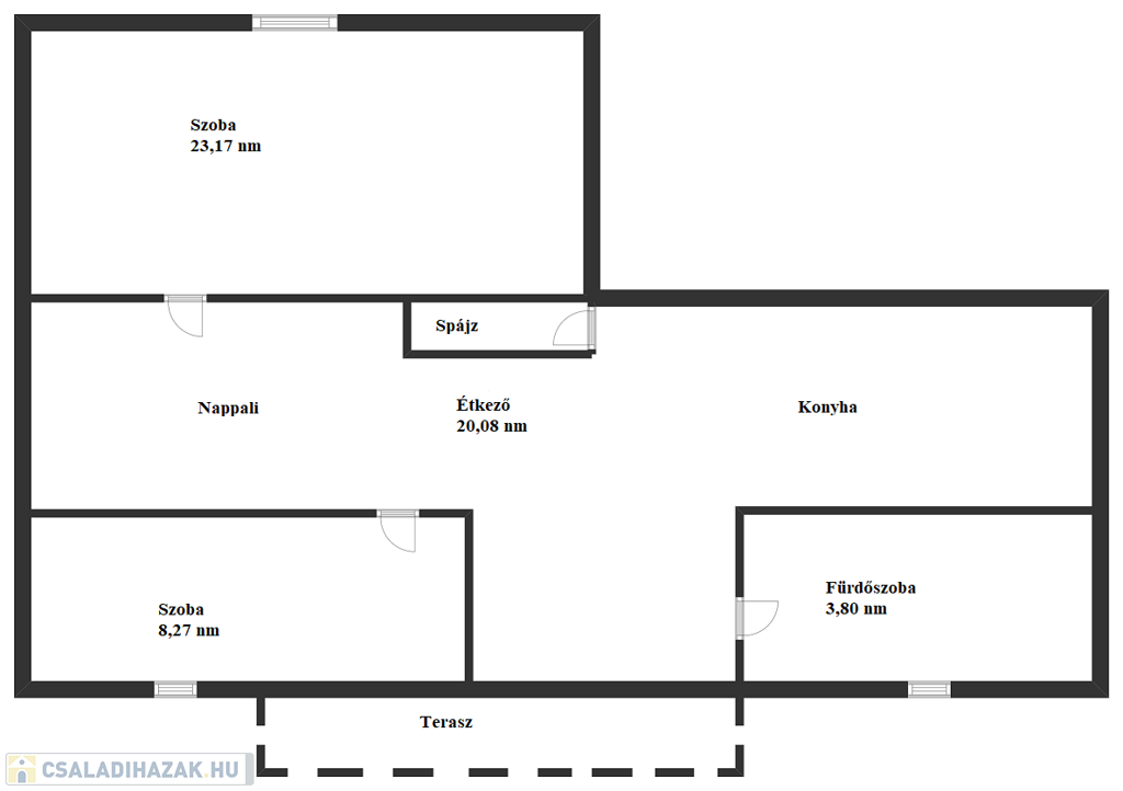 A ház praktikus elrendezésű: a konyha, étkező és nappali egy légtérben található, ami tágas és barátságos hangulatot biztosít. Az ingatlanban két különálló szoba található, amelyek kényelmes életteret nyújtanak.