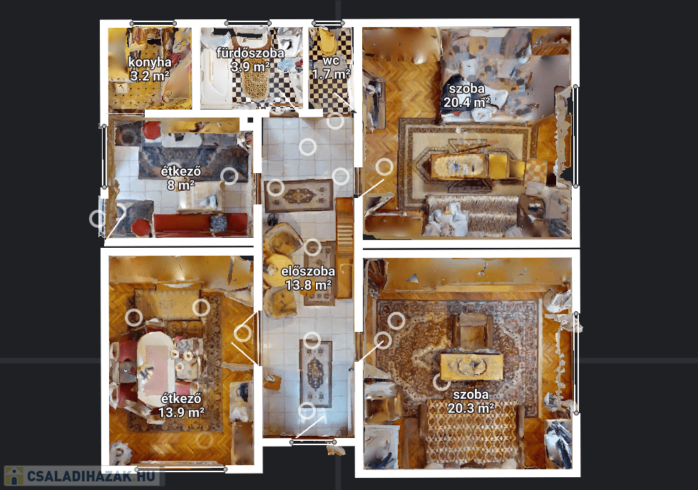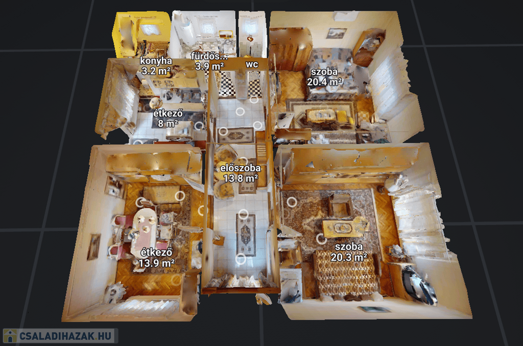 Burkolatok az alsó szinten beton, a fenti lakórészben a szobákban jó állapotú parketta, illetve laminált padló, a közlekedő és a vizes helyiségekben kerámia.