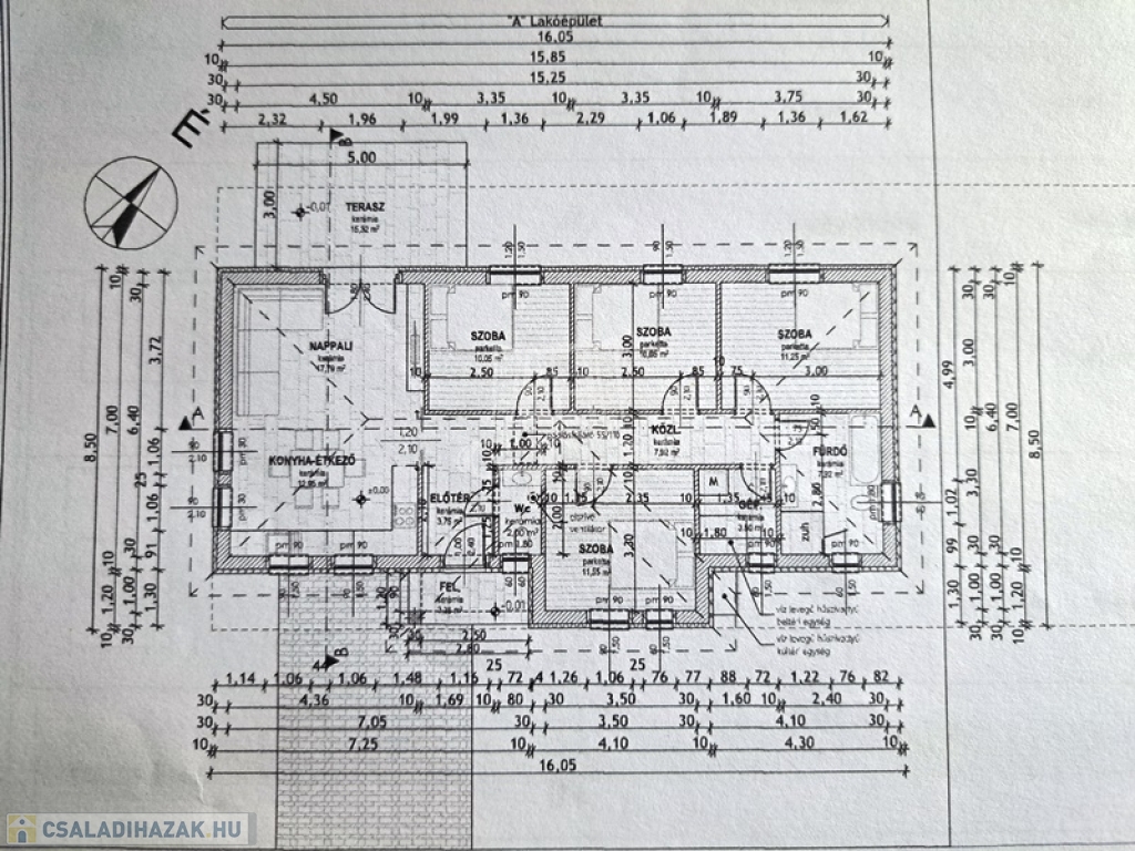 4 szoba egyenként 10,06 m2,10,06 m2, 11,25 m2, 11,55 m2, fürdőszoba 7,92 m2, háztartási helyiség 3,50 m2, közlekedő 7,92 m2