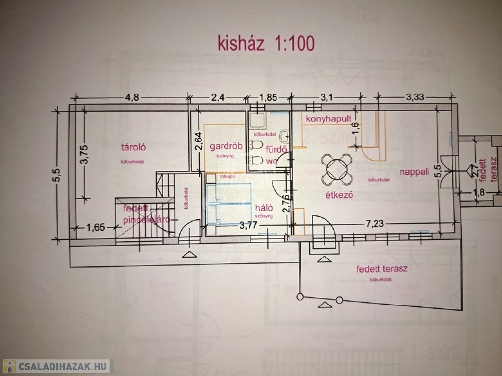 B30-as tégla falazat, hullámpala tető, saját bejárat