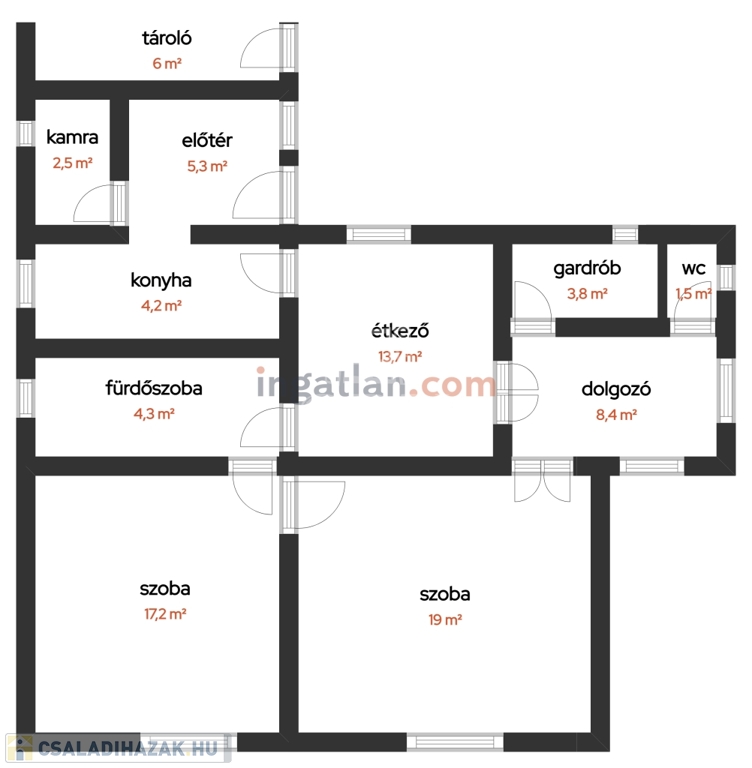szoba 17,9m2, szoba 19m2, dolgozó 8,4m2, étkező 13,7m2, gardrób 3,8m2, fürdőszoba4,3m2, konyha 4,2m2, előtér5,3m2, kamra 2,5m2; fűtőhelyiség 6m2; garázs 14m2; tároló 4m2;