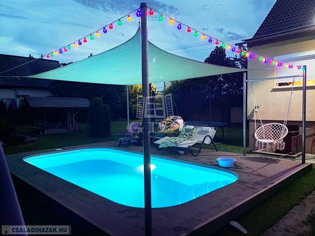 Az 1 éves feltekerhető ponyvás 25m2 kibetonozott, műanyag testű medence, víz alatti világítással, WPC burkolattal, teljes gépészettel,10 kW hőszivattyús fűtésssel,10 kW Solár fűtéssel, összesen 20 kW fűtőteljesítménnyel, krómozott Solari kerti zuhanyzóval várja új tulajdonosát!