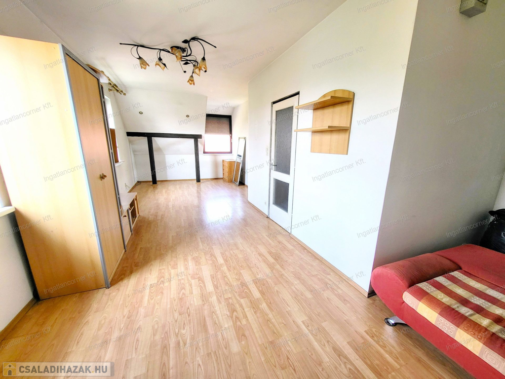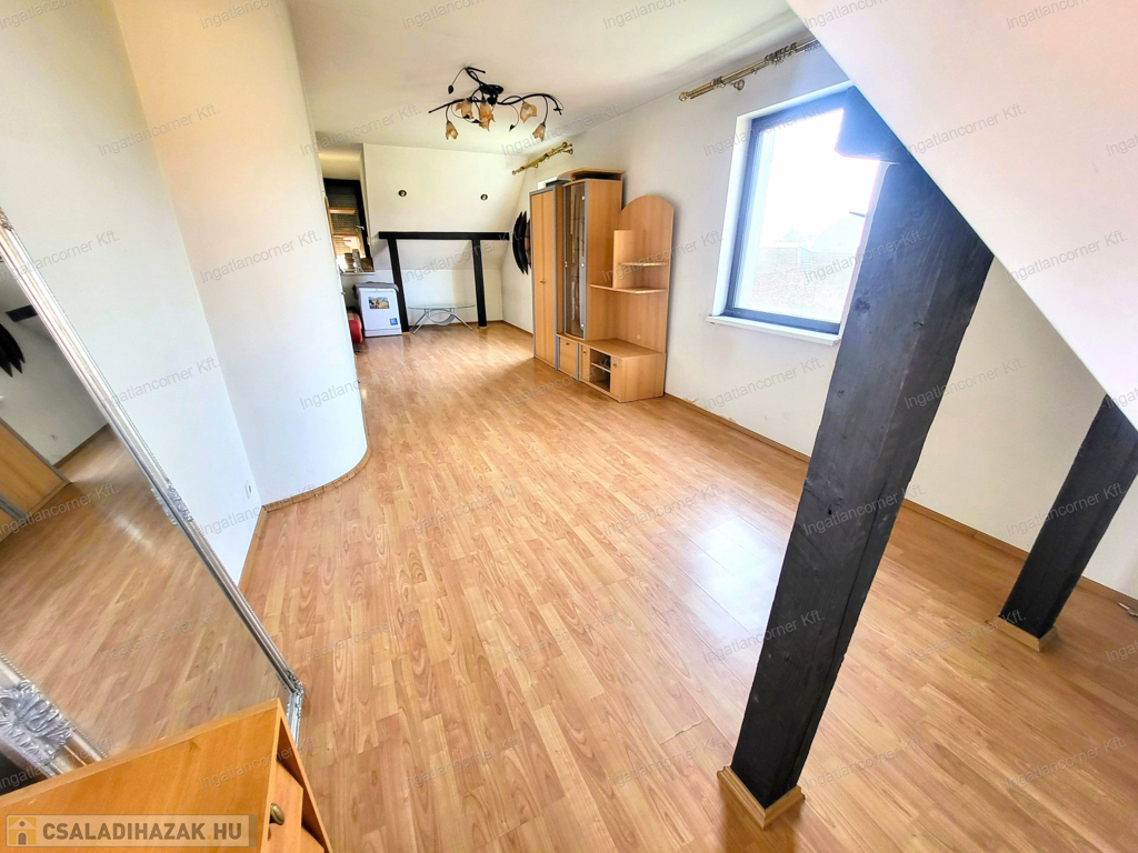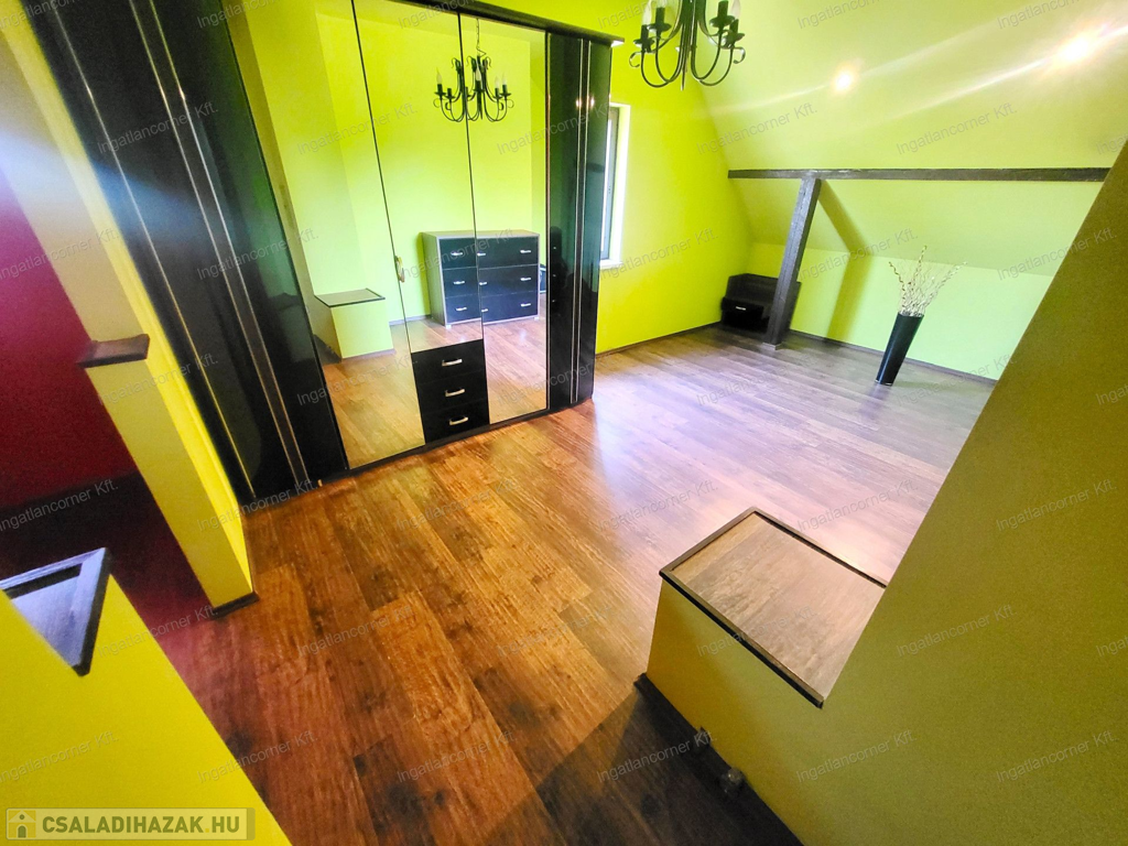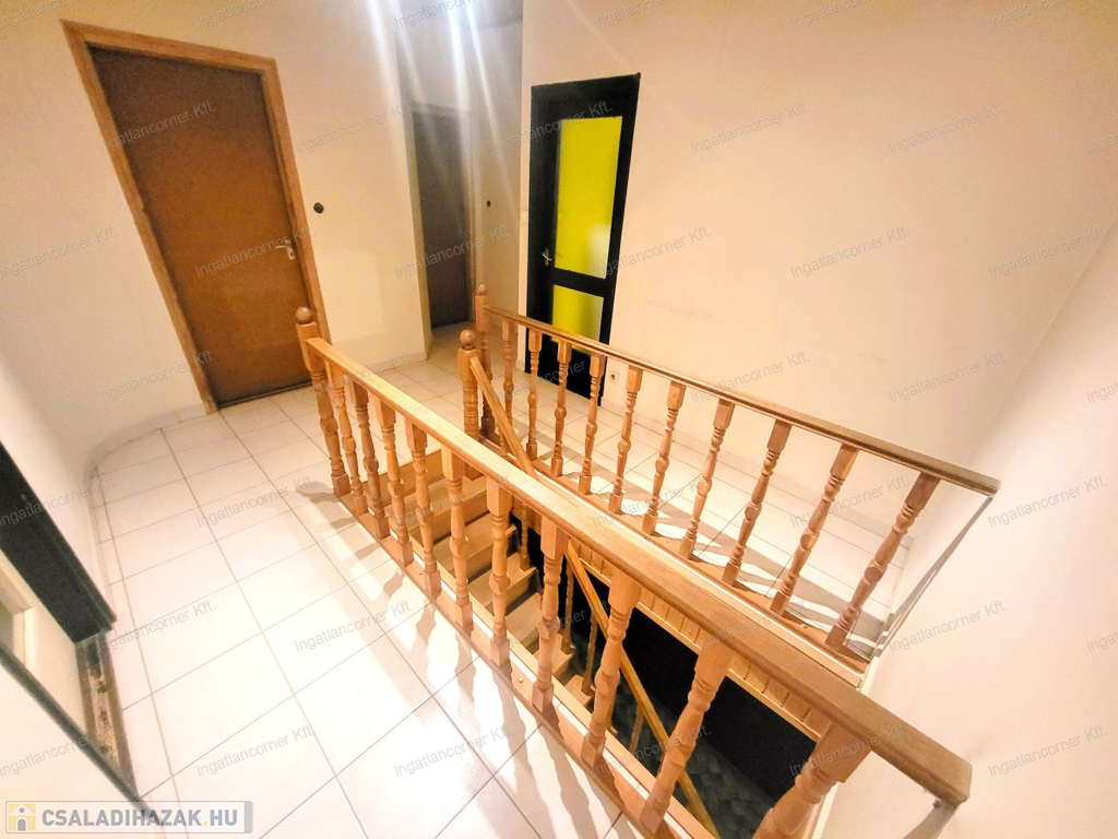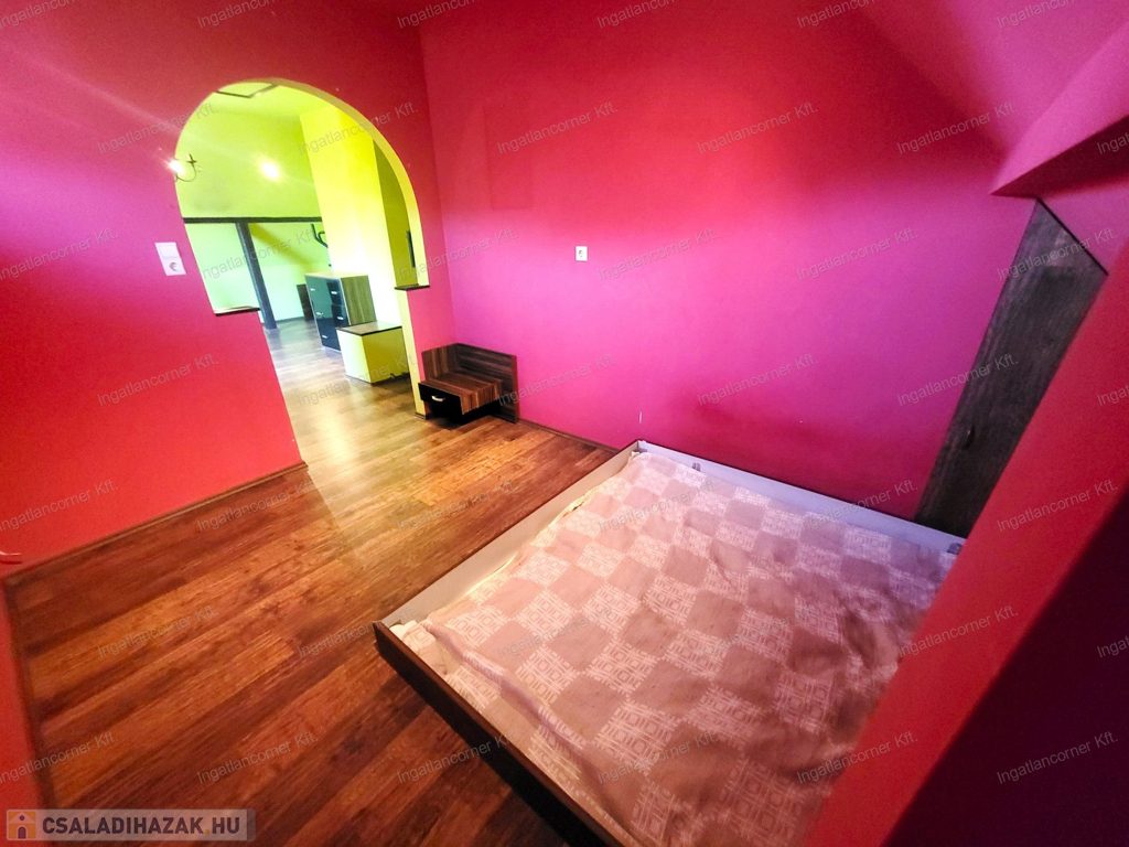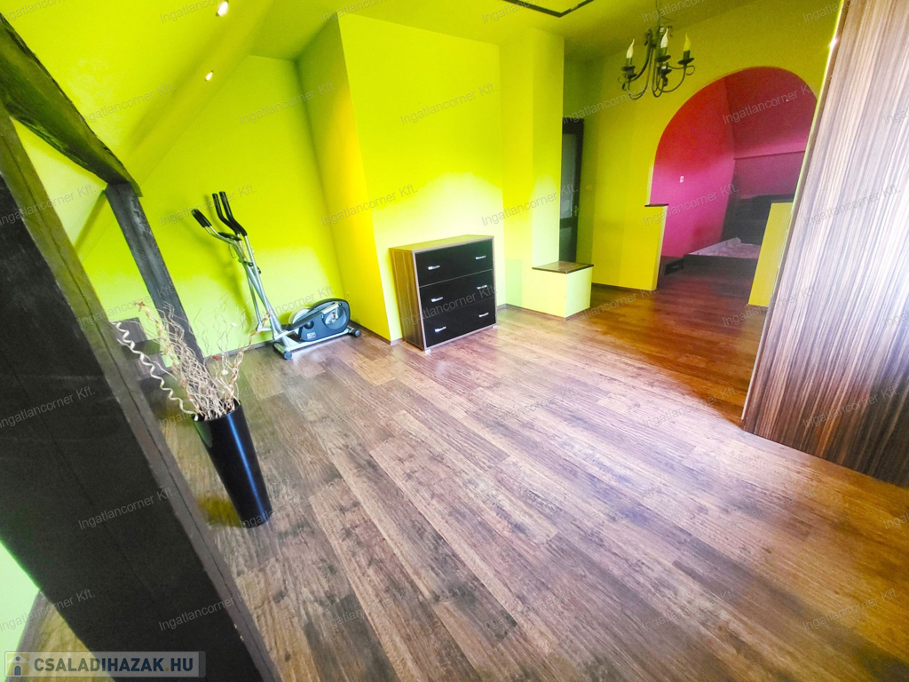 az EMELET: 54,3 m² nettó alapterületű: elosztása kiváló: a lépcsőn felérve egy 5m2-es közlekedőből nyílik, két külön nyíló hatalmas méretű szoba, melynek a nettó lapterülete: 22,4m2 és 18,30m2, melyek igény esetén tovább osztható több helyiségre. A képeken pirosra festett szobában a vizesblokk is felhúzásra került a földszintről, agy akár egy külön konyhának is kialakítható. Továbbá egy külön WC és fürdő helyiség is megtalálható, ahol a vizes blokkok ugyan kialakításra került, de ennek valós kialakítása már az új tulajdonosra vár.