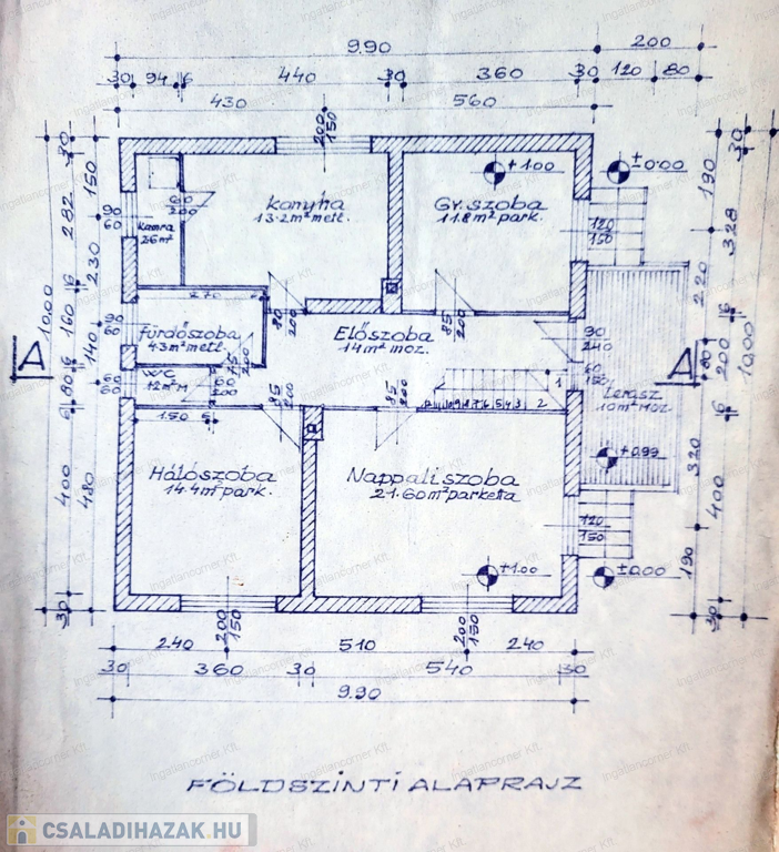 A nettó 137,4m2 lakótérből az ALSÓ SZINT: 83,1m2 (melynek az elosztása: tágas előszoba 14m2, ahol a cipők kabátok kényelmesen elhelyezhetőek, továbbá ebből a térből érhető el kényelmes falépcsőkön keresztül az emeleti szint, balra a tágas 21,60m2-es nappali és két igen jó méretű hálószoba (14,4m2, 11,8m2-rel) egy külön mellékhelyiség (1,2m2) egy káddal felszerelt fürdőszoba, és egy különálló ablakkal rendelkező 13,2m2-es konyha-étkező, melyből egy 2,6m2-es kamra is leválasztásra került)