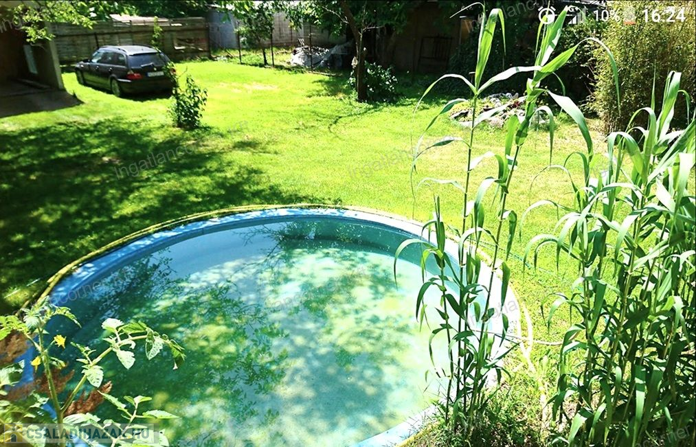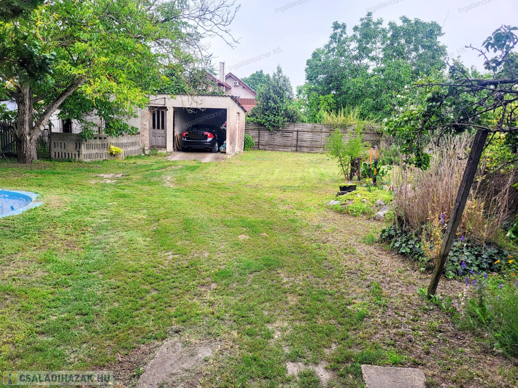 - KERT- UDVAR: A hátsó udvaron található egy 3,7 m átmérőjű, 0,8 m mély betonmedence leeresztő aknával, valamint egy fedett garázs, amely mellett egy állattartáshoz és/vagy tároláshoz használható épületrész helyezkedik el, illetve egy külön FÜSTÜLŐ Az udvaron termő dió-, körtefa és egy fügebokor is található. A telek mérete lehetővé teszi egy nagyobb konyhakert kialakítását is. A kert öntözését és a medence feltöltését fúrt kút biztosítja.
