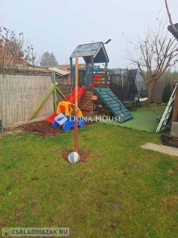 Rendezett kert gyümölcsfákkal, virágokkal, mászóka csúszdával, így gyermekes családok számára is ideális, fúrt kútról öntözhető kert gazdaságos fenntartás