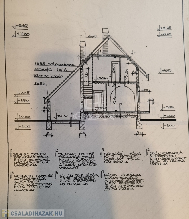 A ház 1987-ben beton sávalapra épült 30-as téglából, a tető héjalása Bramac betoncserép. A tető fújható kőzetgyapot szigetelést kapott,