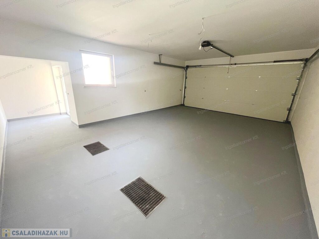 • A garázs és az egyik fürdő már teljesen befejezve, a burkolatok, beltéri ajtók és szaniterek a leendő tulajdonos ízlése szerint alakíthatók ki