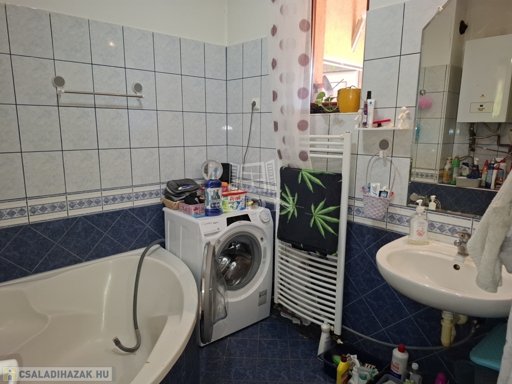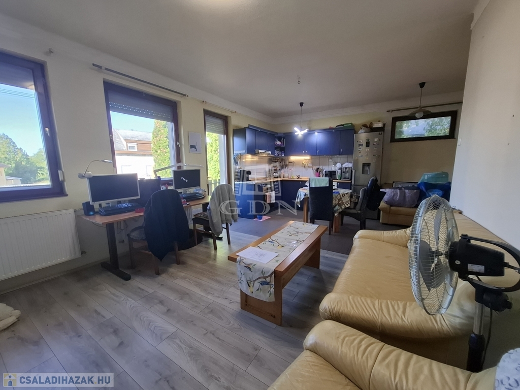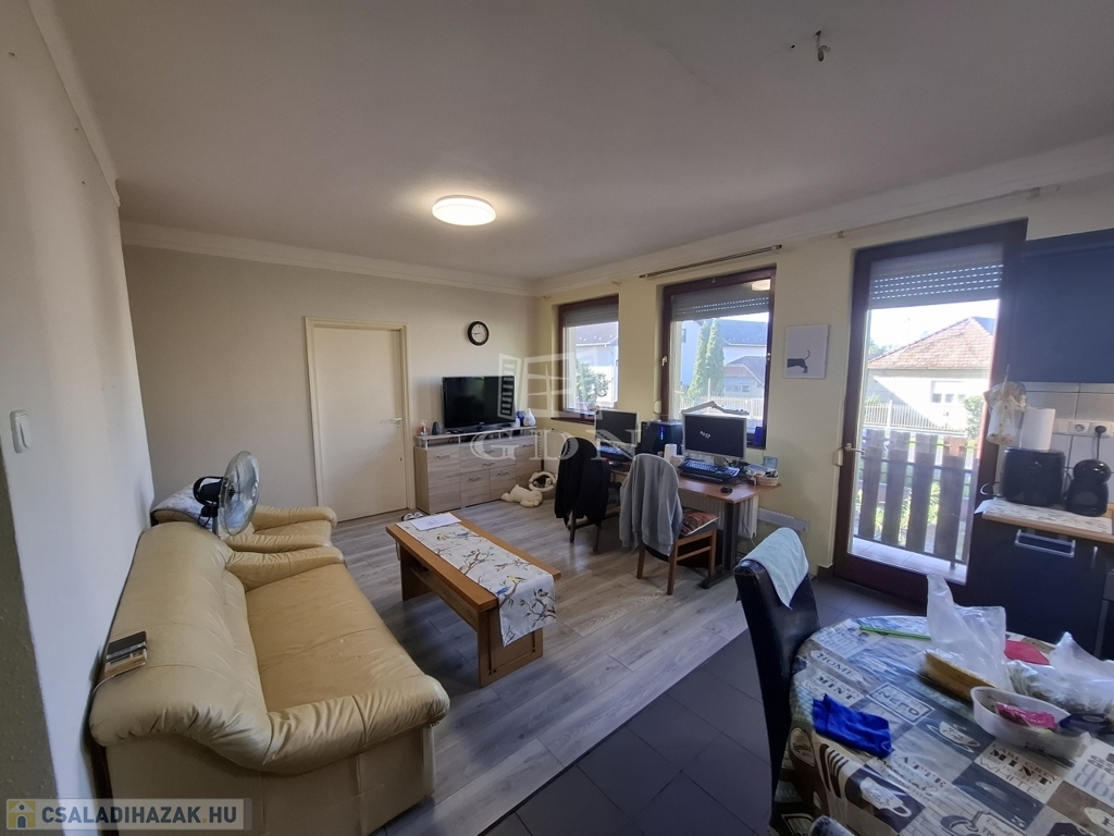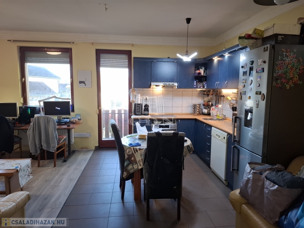 Földszint: fedett teraszon keresztül jutunk a 70 m2-es lakás előterébe, ahonnan elérhető a felső szint, akár külön bejárattal is így a lakás több generáció együttélésére is ideális. A földszint tágas elrendezése: amerikai konyhás nappali, kamra, két szoba, fürdőszoba és külön WC elosztású.