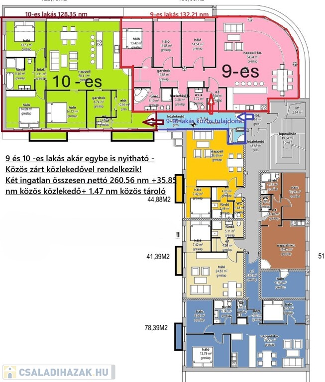 A lakást egy 35,85 m²-es, zárt, kizárólagos használatú közlekedő kapcsolja a mellette lévő ingatlanhoz, amely elegáns, közös előtérként fogadja az érkezőket. Így a két külön bejáratú lakás külön is használható, mégis könnyedén egyetlen harmonikus egésszé alakítható.