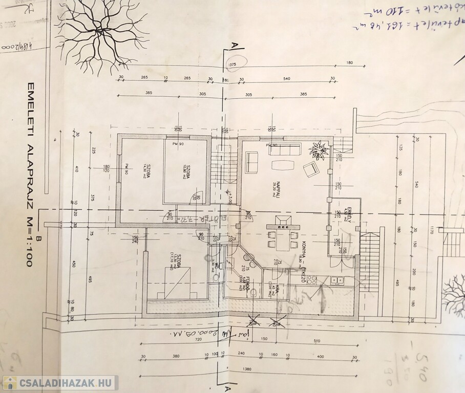 Az EMELET 120nm, helyiségei: amerikai konyhás nappali 18nm, + kandallós nappali 29nm, + 3 szoba 11nm; 13nm;14nm. A szobából és a konyhából közvetlen kijárat van az erkélyre.