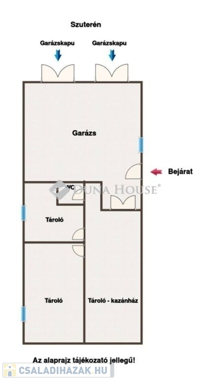 Szuterén szinten garázs és külön lakrész. A szuterén szinten található a 32 nm-es, dupla garázs, amely két elektromos kapuval felszerelt. A garázs mögött egy 41 nm-es, külön bejárattal rendelkező tárolórész lett kialakítva, ahová minden közmű bevezetésre került. Ebben a részben kapott helyet a gázkazán és a melegvíz-tároló is. A kialakítás lehetővé teszi, hogy ez a szint külön lakásként, irodaként vagy akár vállalkozási célra például kozmetikának is hasznosítható legyen.