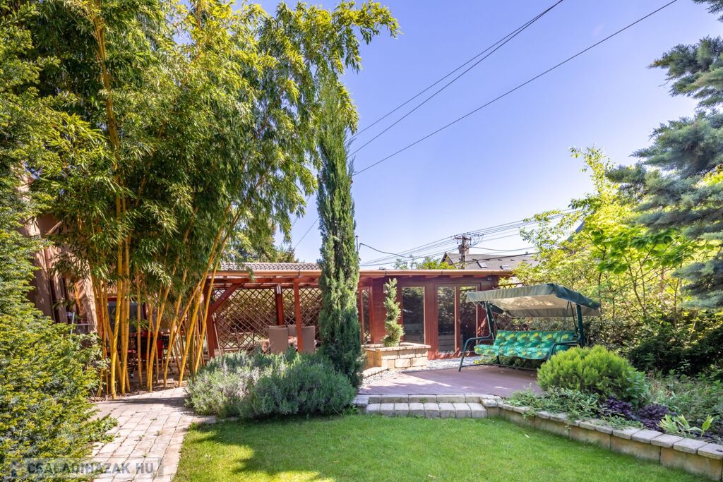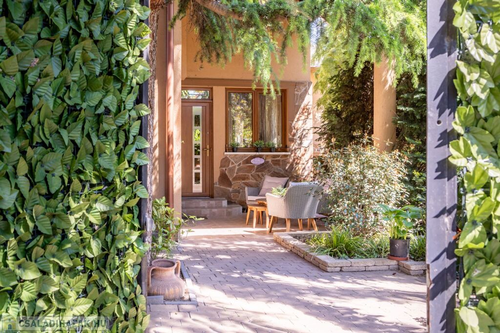 A fedett terasz és a jakuzzi mellet a kertben egy automata vízforgatóval telepített kis tó került kialakításra.