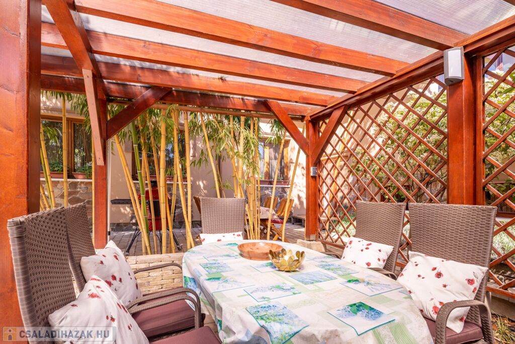 A zárt jakuzzi a kertben külön épületben helyezkedik el, előtte fedett terasz található.