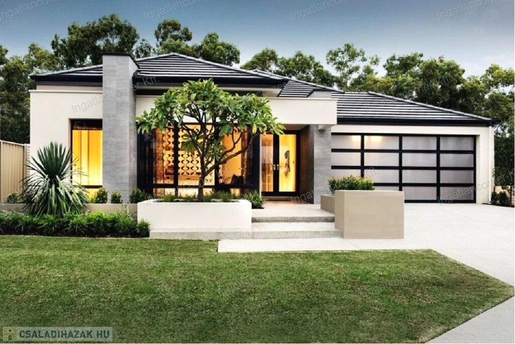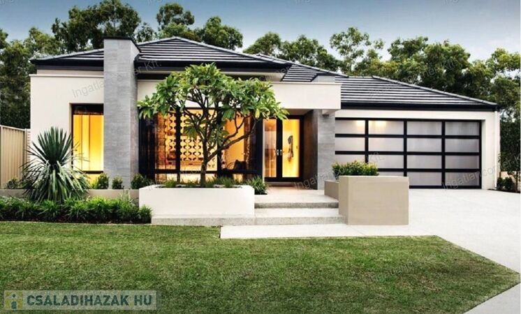 A ház LUXUS kivitelezésű, 70 m2-es TERASSZAL, NAGY MÉRETŰ NYÍLÁSZÁRÓKKAL, DUPLA GARÁZZSAL ELLÁTOTT.