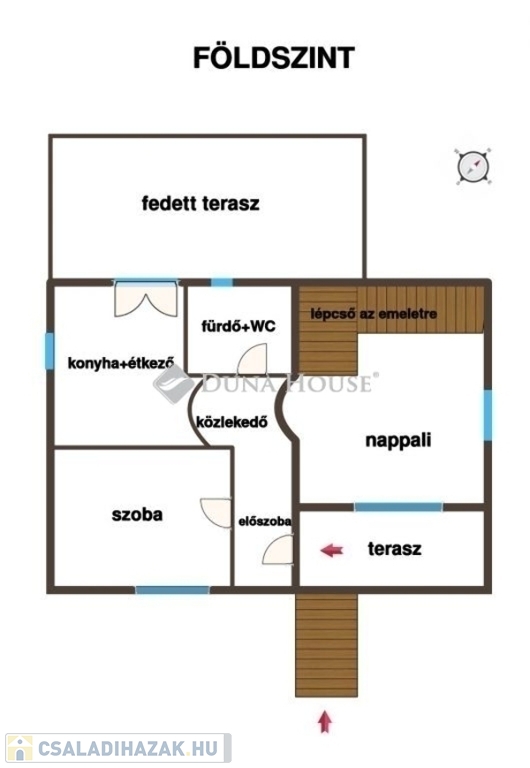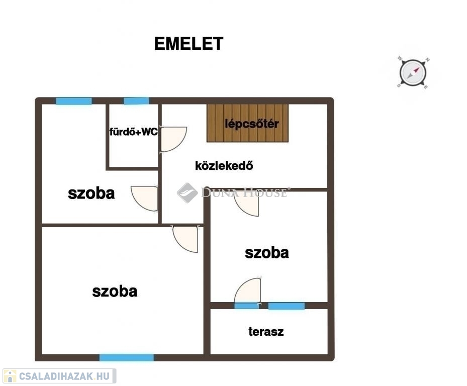 Az ingatlan elosztását tekintve:- a földszinten: előszoba, nappali, 1 szoba, konyha-étkező, (kádas) fürdő + WC közlekedő, elől és hátul is terasz;-az emeleten 3 szoba, közlekedő, (zuhanyzós) fürdő + WC, terasz.