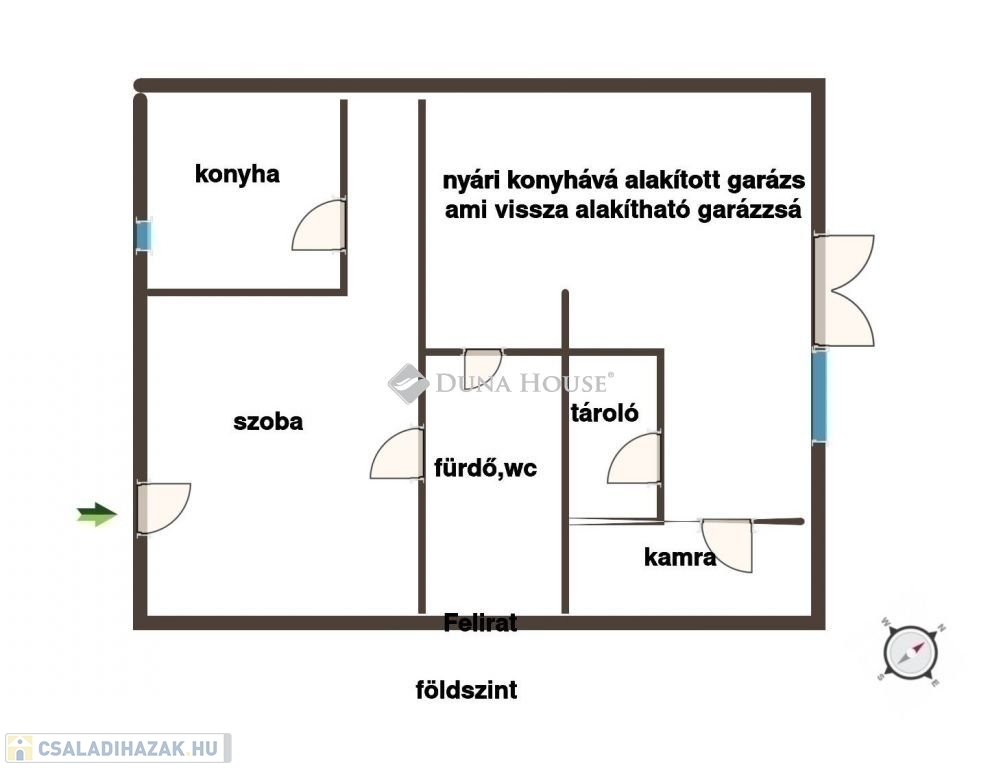 Garázs: jelenleg nyári konyha és tárolóként funkcionál, de bármikor újra garázzsá alakítható. A garázs és kis a lakás egy szinten van, így akár egybe is nyitható és otthoni vállalkozásnak is helyet tud adni.