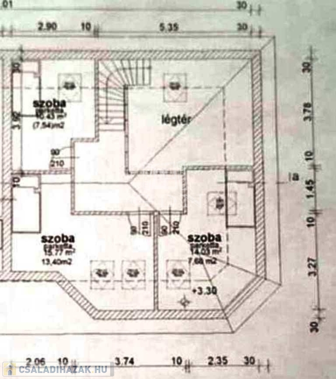szoba 13,4m2, szoba 7,7m2, szoba 7,6m2, közlekedő-előtér 12m2, mosdó-zuhanyzó 7,15m2, toalett 2,64m2, gardrób 12,76m2;