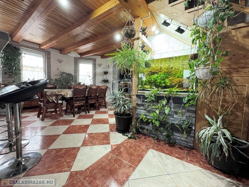 A parkosított, gondozott kert, fedett gépkocsi beállóval, fedett terasszal, fúrt kúttal, tárolóval várja új tulajdonosát!