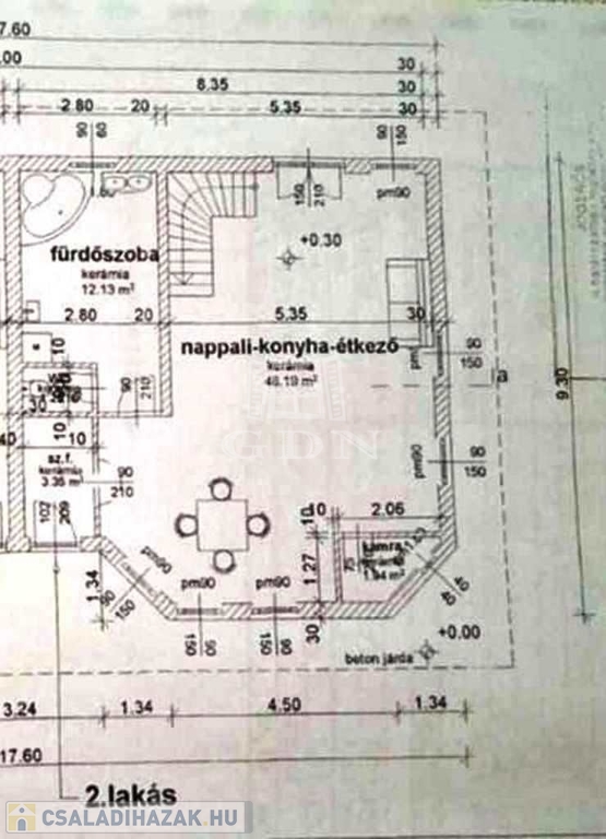 Földszint: nappali -konyha-étkező 48,2m2, előtér 3,35m2, fürdő 12,13m2, toalett 1,2m2, kamra 1m2, fedett terasz 25m2;