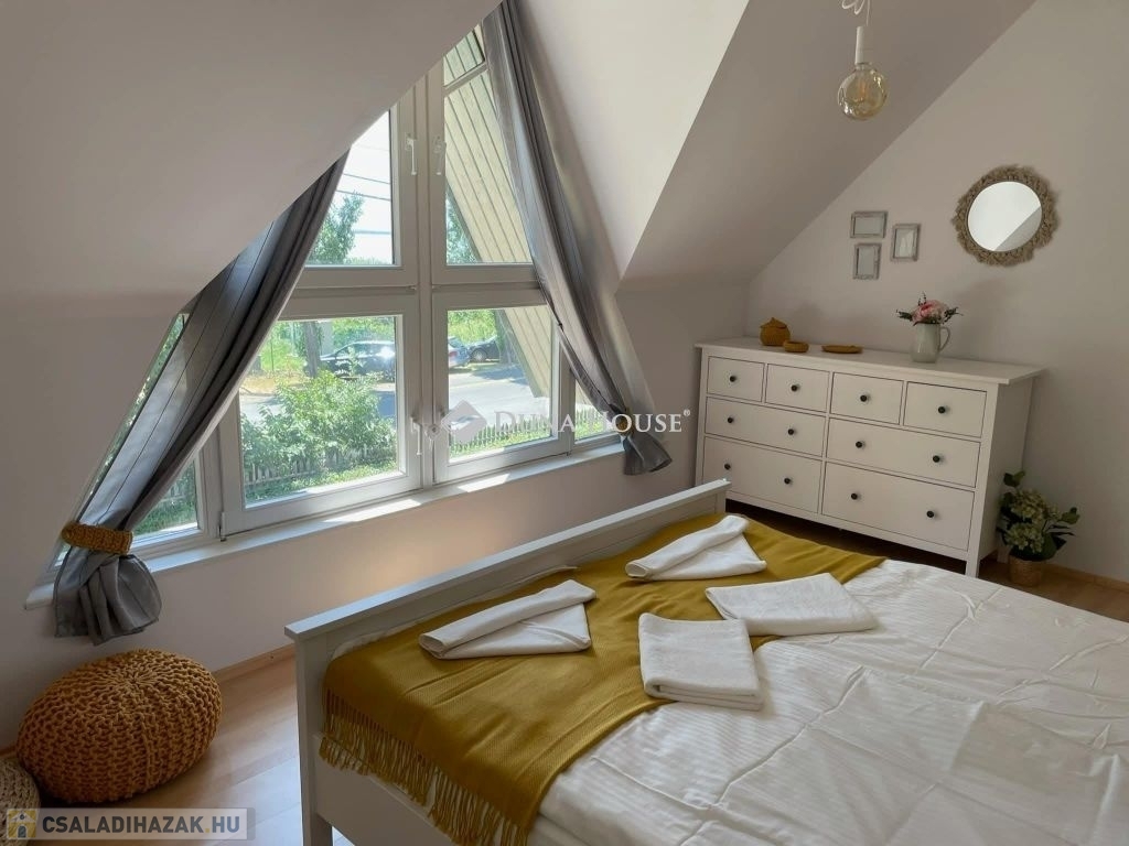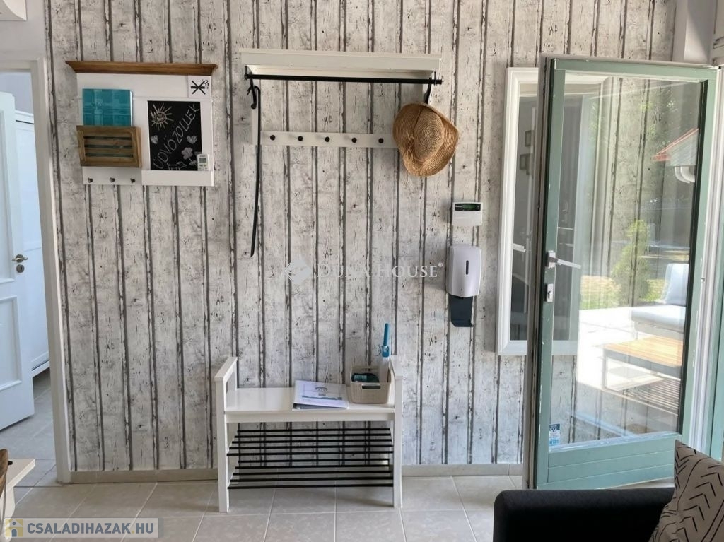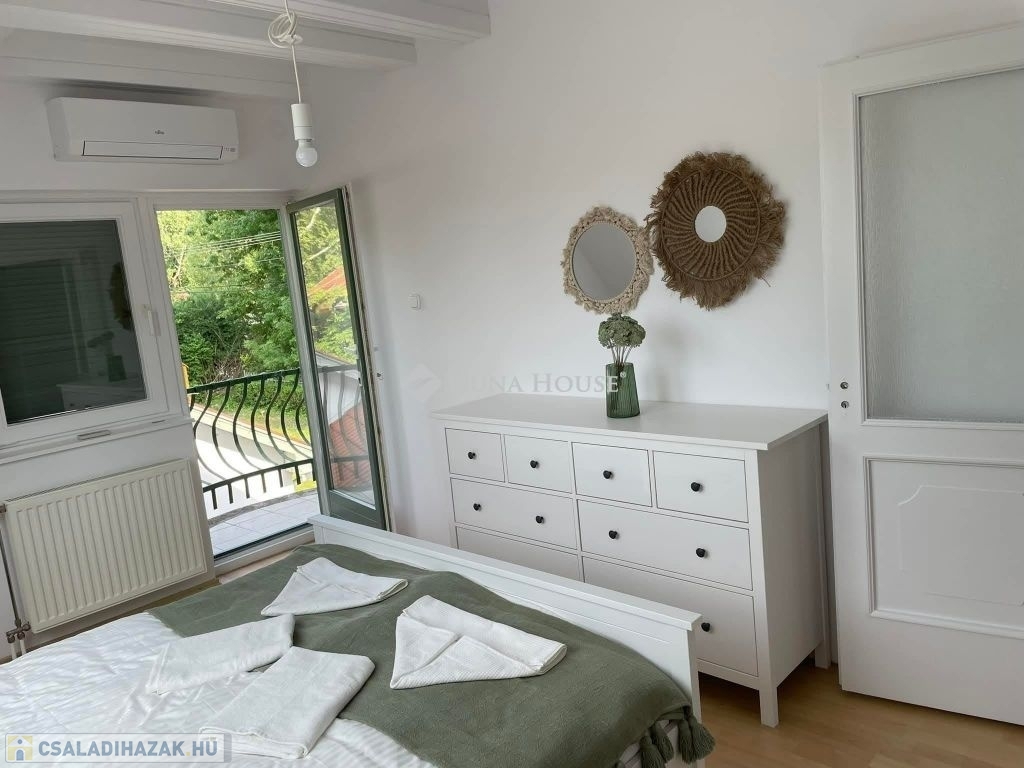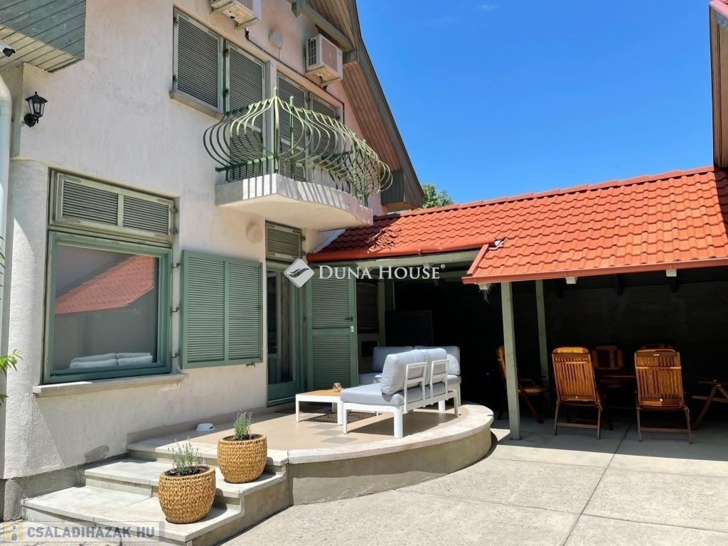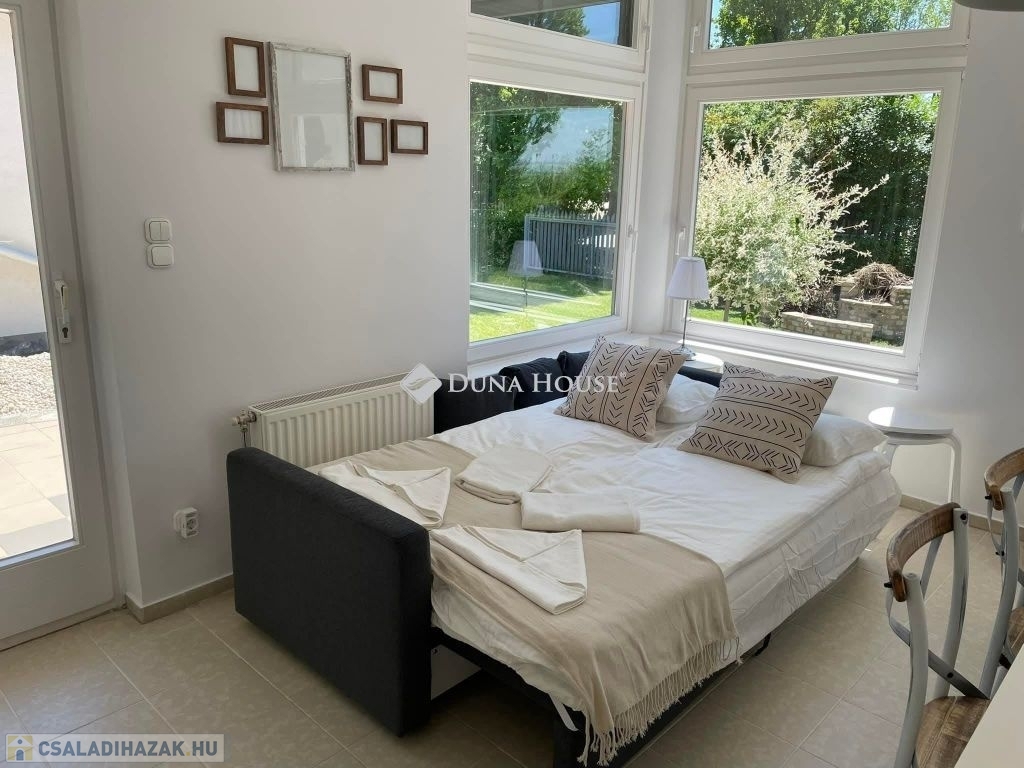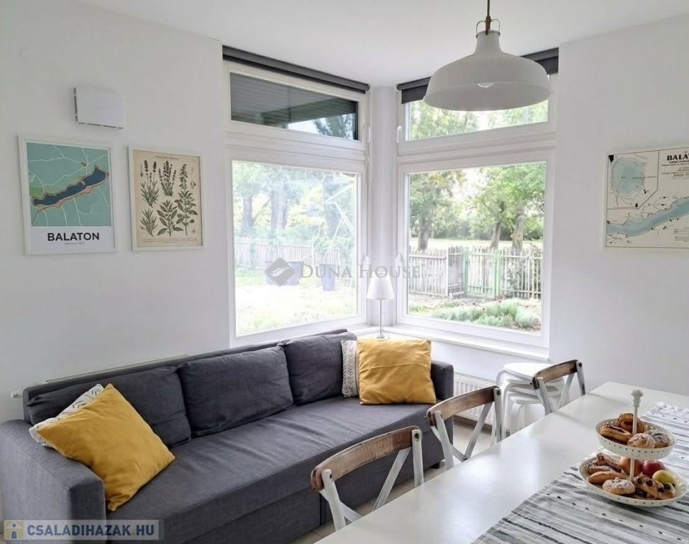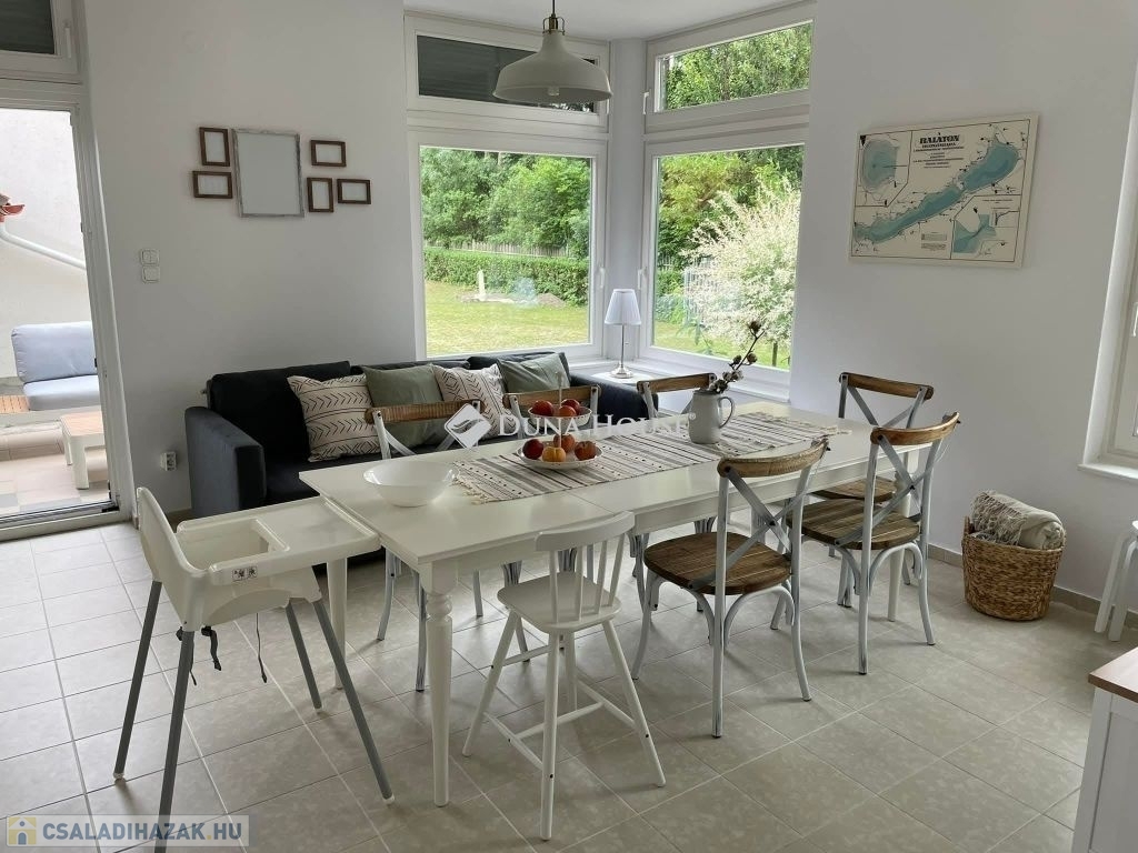 Szigligeten, a Fürdő utcában kínálunk megvételre egy kivételes adottságú, közvetlen vízpart közeli ingatlant, amely egy helyrajzi számon található, mégis két teljesen elkülönített lakrészként működik. Az ingatlan előtt futó út túloldalán már a Balaton található, a strand mindössze 120 méterre elérhető, miközben a településen nincs vasúti közlekedés, így a környezet nyugodt és zavartalan.A két lakrész külön-külön is használható és értékesíthető, ugyanakkor egyben egy olyan komplex ingatlant alkotnak, amely ritka lehetőséget kínál mind saját használatra, mind befektetési célra.A teljes nettó lakótér megközelítőleg 212 m², amely két szinten helyezkedik el. Az ingatlan összesen hét szobával rendelkezik, ebből több hálószoba és két nappali jellegű élettér biztosítja a kényelmes használatot. A vizesblokkok elosztása jól átgondolt: az ingatlanban összesen két fürdőszoba, négy WC és két zuhanyzó áll rendelkezésre, így több fő egyidejű használata is kényelmesen megoldható.A keleti lakrész jelenleg is sikeresen működő vendégházként üzemel, stabil bevételi lehetőséget biztosítva, így az ingatlan nemcsak otthonként, hanem kész üzleti modellként is megállja a helyét.A külső terek külön értéket képviselnek: több terasz és erkély áll rendelkezésre, amelyek közül több balatoni kilátással rendelkezik, az emeleti egyik hálószobából pedig panoráma nyílik a Balatonra. A kert parkosított, automata locsolórendszerrel ellátott, a pihenést dézsa és szauna teszi teljessé.A gépjárművek elhelyezését két darab, egyenként 18 m²-es, önálló garázs biztosítja, amelyek közül az egyik elektromos autó töltésére alkalmas kialakítással rendelkezik.Műszaki szempontból az ingatlan jó állapotú, tégla szerkezetű, a fűtést gázkazán biztosítja, a melegvízellátás villanybojlerrel megoldott. A komfortot összesen hat darab Daikin hőszivattyús klímaberendezés biztosítja, amelyek távolról is szabályozhatók, így az ingatlan érkezés előtt is előkészíthető. A helyiségek klimatizáltak, az üzemeltetés korszerű és gazdaságos. Mindkét lakrészben található egy-egy Haas+Sohn fatüzelésű kandalló, amely hangulatos és kiegészítő fűtési lehetőséget is biztosít.A biztonságról kiépített kamerarendszer és riasztórendszer gondoskodik, a bejutást elektromos, távirányítással működtethető kapu biztosítja.A teljes telek mérete 1384 m², amely ügyvéd által készített használati megosztással két részre osztott. Mindkét lakrész külön bejárattal, saját telekrésszel és külön közműórákkal rendelkezik, így használatuk egymástól független, használatában mindkét oldal önálló családi ház érzetét nyújtja.Az ingatlan külön-külön és egyben is megvásárolható, amely egyedülálló rugalmasságot biztosít a leendő tulajdonos számára.