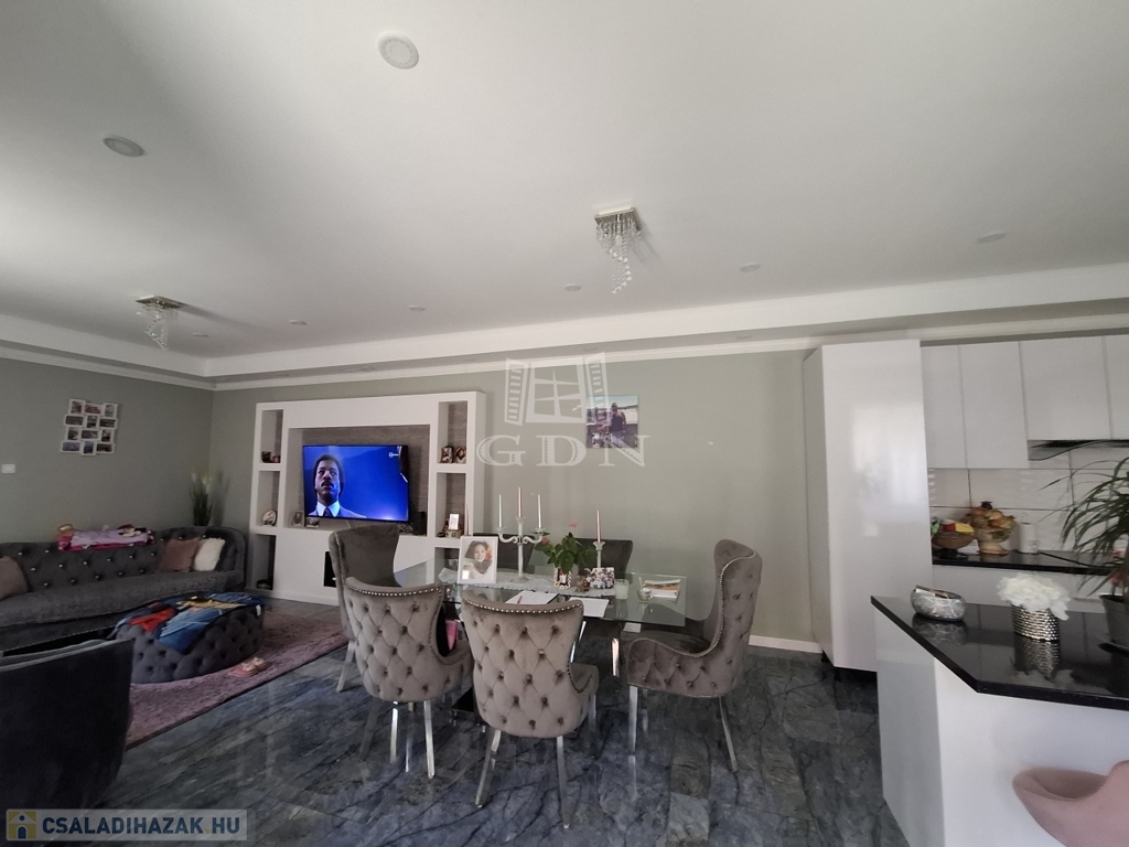 A közel 140 négyzetméteres házhoz egy 30 m2-es fedett terasz is tartozik mely a nappaliból is megközelíthető.