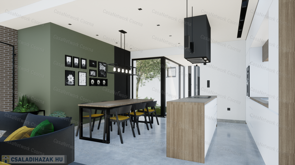 konyha-étkező-nappali együttese, melyet a fedett terasz egészít ki a kert felé