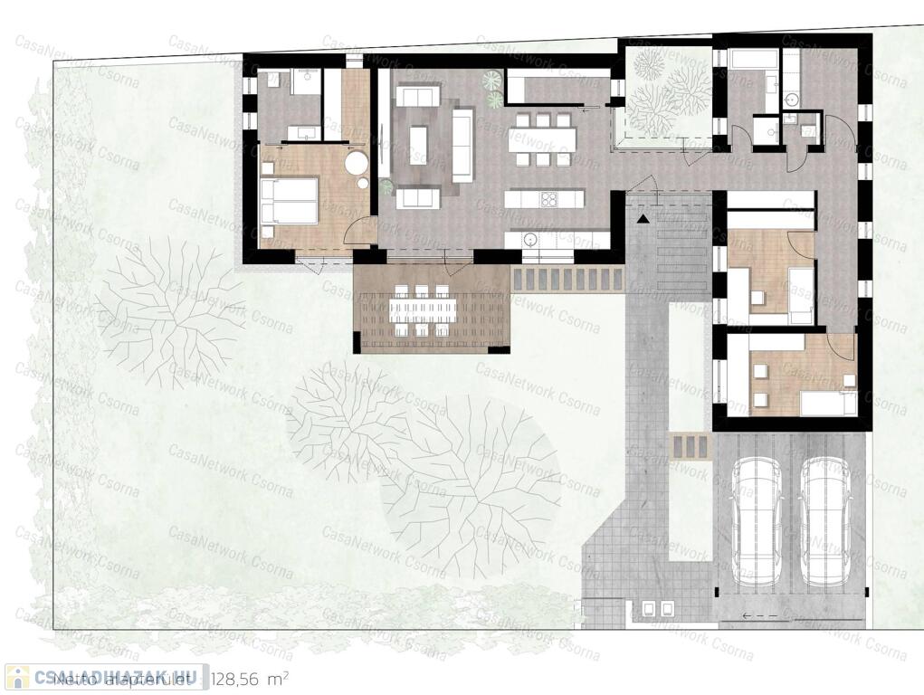 alakítottunk ki, mely szintén kertkapcsolatos. Helységlista:előszoba, belső átrium, nappali-étkező-konyha, kamra, 3 hálószoba,