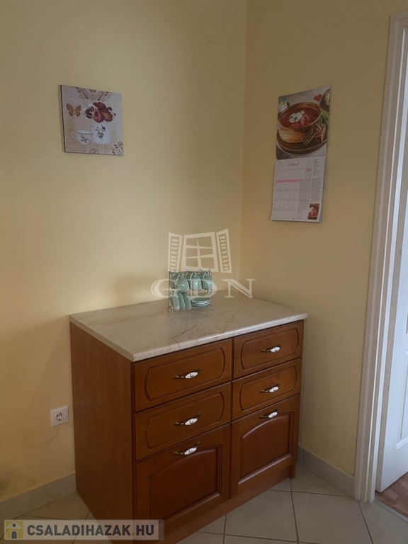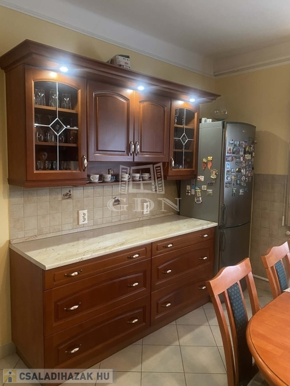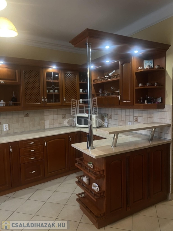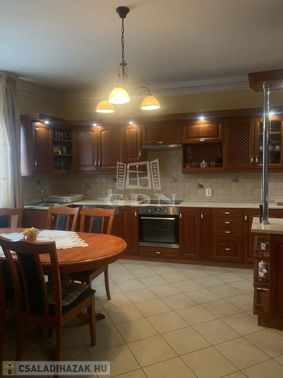 A ház egyik különleges értéke a gyönyörű, egyedi, tömörfából készült konyhabútor, amely elegáns, időtálló megjelenést biztosít.